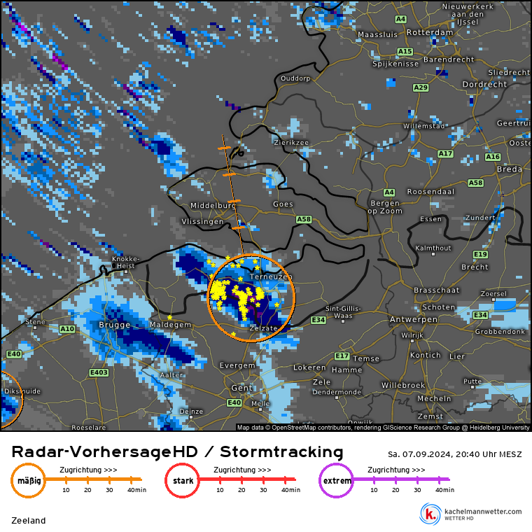 Dat is bij den Inkel zo te zien? Dan kijk je rechts over de zak van Zuid Beveland, en links zie je Zeeuws Vlaanderen. De funnel zie ik tussen de twee cellen in, naar mijn smaak net niet de goede plaats om een tornado te worden, maar dat wil ik niet te hard zeggen. De locatie ervan is dan echter ergens bij IJzendijke (de afstand is al gauw veel groter dan je denkt), en daar moet dan toch wel een waarneming zijn? Klopt het dat je foto rond 20:40 genomen is?