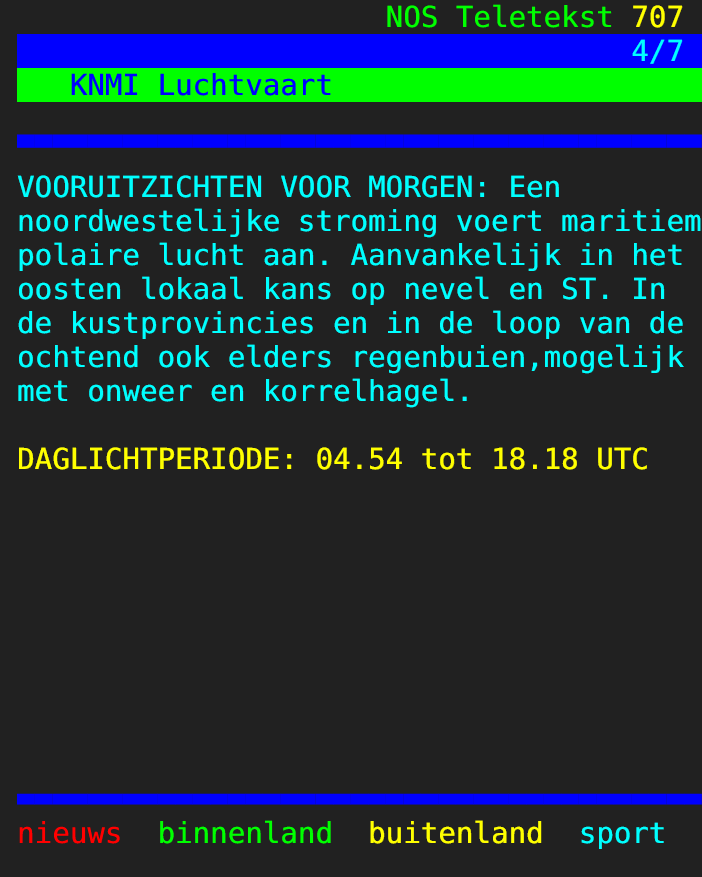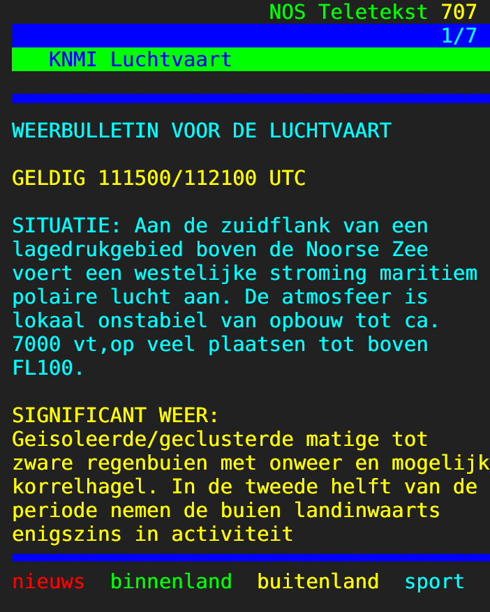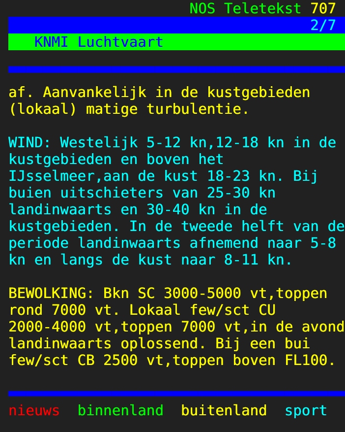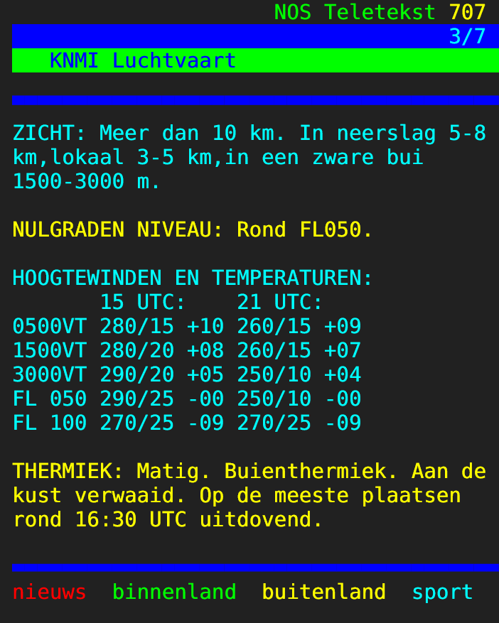 P 707 Weerbericht voor de Kleine Luchtvaart is voor mij n prima weerbericht hoor, zelfs met hoogtetemps en windrichting en de Metars van de luchthavens. Zolang ze die nog binnenboord houden blijf ik TXTfan!