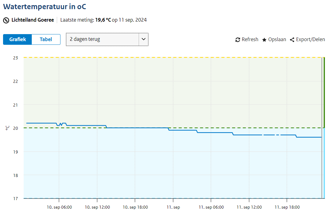 Noordzeewater koelt slechts enkele tienden van een graad per dag af. Binnenwater gaat wel wat sneller. Hieronder Lichteiland Goeree van de afgelopen twee dagen (bron: https://waterinfo.rws.nl/#/publiek/watertemperatuur):