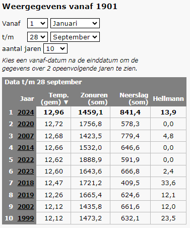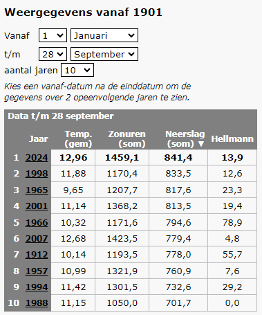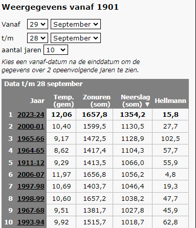 En dat komt ook mooi tot uitdrukking als je naar de neerslag van het laatste jaar kijkt.. 29 september vorig jaar t/m gisteren. Dan zitten we op maar liefst 1354,2 mm!! Een grote voorsprong op de nummer 2 in die ranglijst.