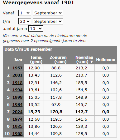 Laten we beginnen bij deze september. Die staat namelijk met alle neerslag van deze week inmiddels alweer op de 7de plaats van natste septembers ooit.