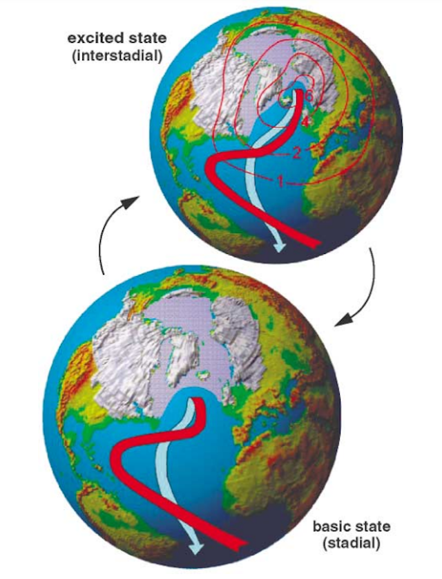 Het onderstaande plaatje van Ganopolski en Rahmstorf betreft de onstabiliteit van de AMOC gedurende de laatste ijstijd, die afwisselend zo goed als stil lag en dan via een zogenaamd D-O-event plotseling weer op gang kwam, met een sterke maar meestal tijdelijke opwarming als consequentie. Sinds het einde van de laatste ijstijd is de AMOC echter redelijk stabiel, in de moderne tijd vertoont deze van tijd tot tijd helaas enige zwakte. De uitwerking hiervan op het klimaat is om wisselende redenen niet altijd even eenduidig.