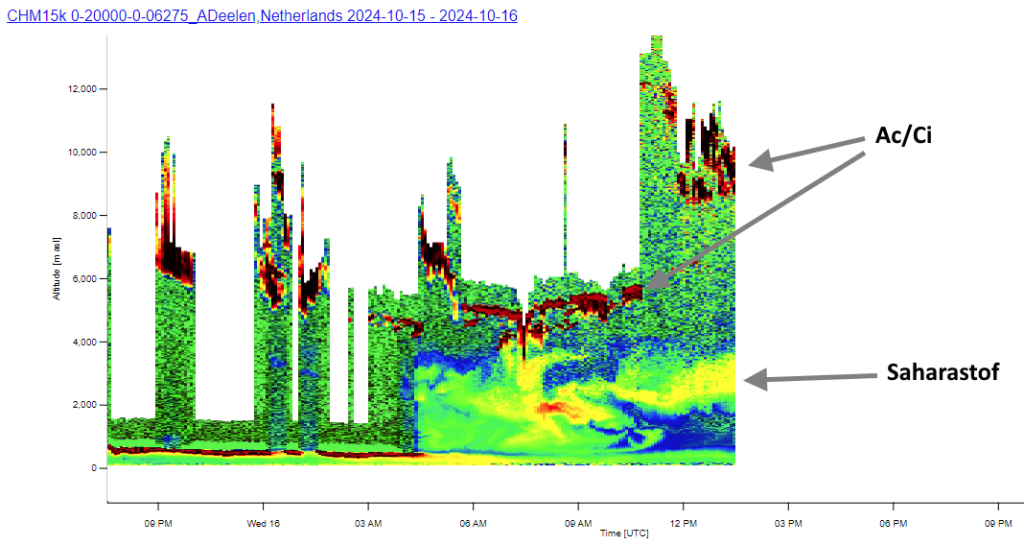 Aantal zonuren tot nu toe 3.5 uur. Onder de hoge- en middelbare bewolking zit trouwens ook een laagje met wat Saharastof tussen 2-3 kilometer. Is echter te ver verdund om met het blote oog te kunnen waarnemen.