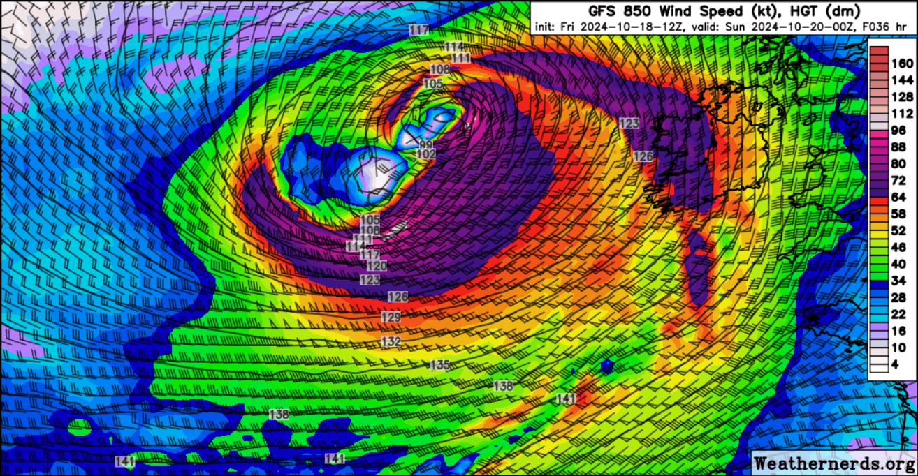 In het lagedrukgebied is er volgens GFS sprake van een hoge positieve vorticiteit op een hoogte van 850 hPa. Daardoor beweegt het lagedrukgebied counter-clockwise en de hoge positieve vorticiteit is ook een bijdrage bij het intensifiëren van Ashley. Op 850 hPa hoogte zijn er dan volgens GFS windsnelheden van ongeveer 150-180 km/u. Aan de grond zal het op de Atlantische Oceaan resulteren in windstoten van ongeveer 120-150 km/u op basis van de 850 hPa windsnelheden. Daarin wordt er geen rekening gehouden met de ontwikkeling van een volledige sting jet, die kans is aanwezig, waarbij de lucht van grote hoogte daalt richting het aardoppervlak. Bij een sting jet accelereert de dalende lucht ook nog eens voor een nog sterker effect, waardoor er op het aardoppervlak extreem zware windstoten kunnen worden waargenomen.
