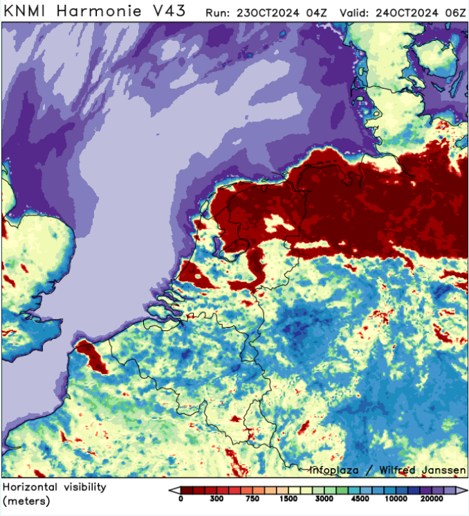 Ik denk dat mist morgenochtend in jouw omgeving heel goed mogelijk is. Volgens Harmonie V43 (Run: 04z) lijken er vannacht en morgenochtend kleinere mistgebieden over Gelderland en andere provincies in het midden/zuiden van Nederland te trekken. Daarnaast is er een groot mistgebied boven het noorden van Nederland berekend voor dezelfde tijdstippen.