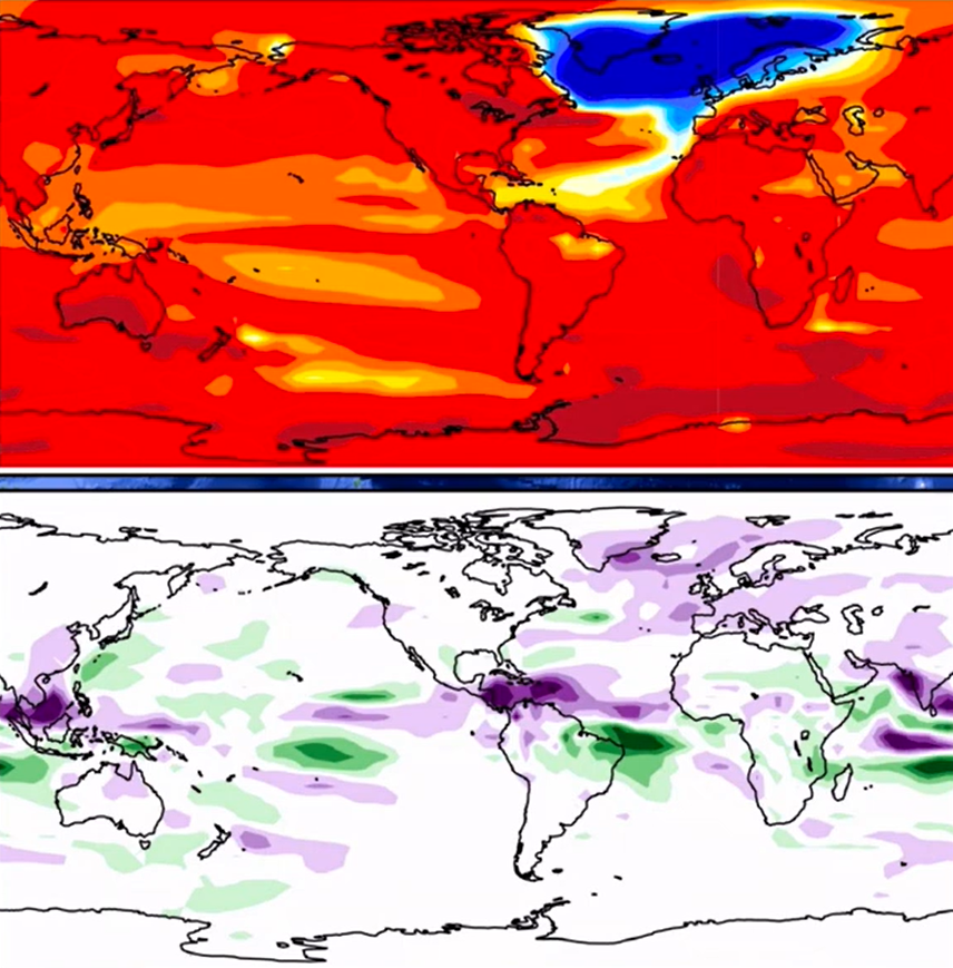 Plaatje 1 is wat Van Westen berekent voor een langdurig verzwakte (of stil gevallen) AMOC. Daar overheen kun je dan nog de AGW leggen, dan krijg je het plaatje van Liu. Het laatste lijkt me wat wel gechargeerd voor wat betreft het contrast tussen de afkoelende en opwarmende gebieden.