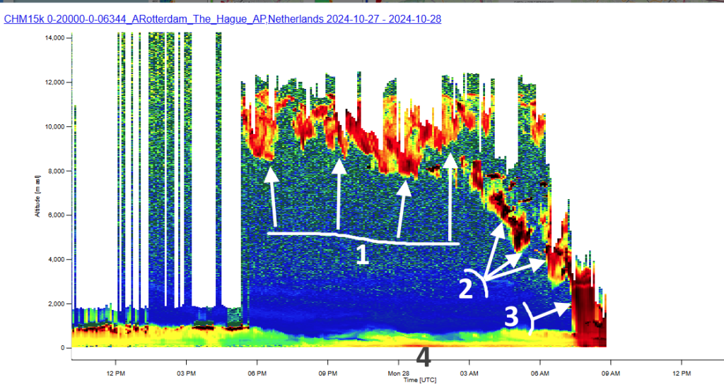 De 'ladder' van het warmtefront die we momenteel afdalen is goed zichtbaar op de LIDAR (wolkenhoogtemeter). Stapsgewijs dalen we van hoge bewolking steeds een trede (of sport