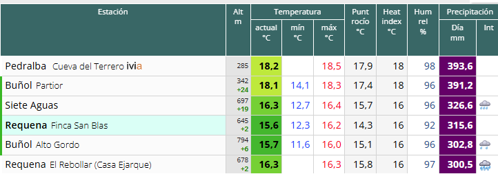Het gebied ten westen van Valencia langs de snelweg A-3 tussen de stad en Utiel is vandaag zwaar getroffen door aanhoudende onweersbuien. Op de satelliet zie je duidelijk dat een onweerscomplex al nagenoeg de hele dag stationair ligt en blijft aangroeien op dezelfde plek. Explosieve situatie met nog relatief warm zeewater (T +21), een hoogtelaag met verkouden bovenlucht (T500 in de kern van het hoogtelaag -22) en bergen west van Valencia die als extra activatiekanon fungeren. Op het station Chiva (circa 30km west van Valencia) zou zelfs meer dan 400mm zijn gevallen. Ook op een secundair meetnet in die regio (AVAMET) zijn er meerdere stations met een dagsom boven de 300mm, en een enkeling zelfs richting de 400mm. Op het hoofdnetwerk van de Spaanse weerdienst (AEMET) gaat Turis met 200mm aan kop, maar dit station heeft nog maar tot 16:00 uur doorgegeven. Denk dat we hier nog wel meer van gaan horen...