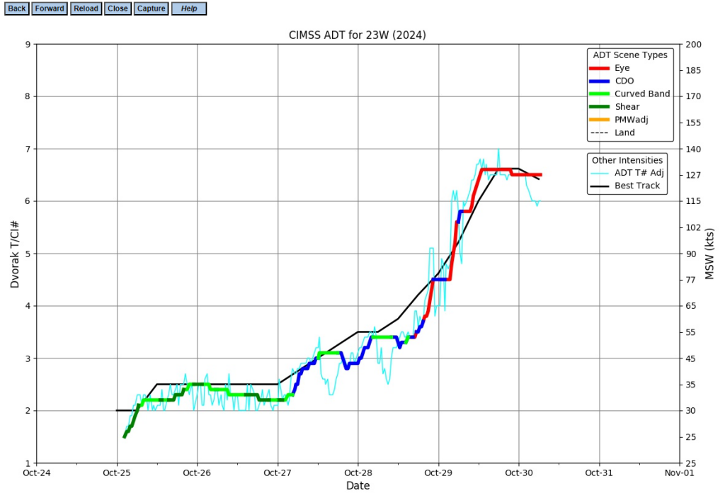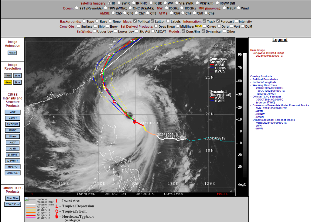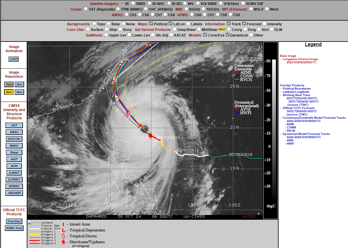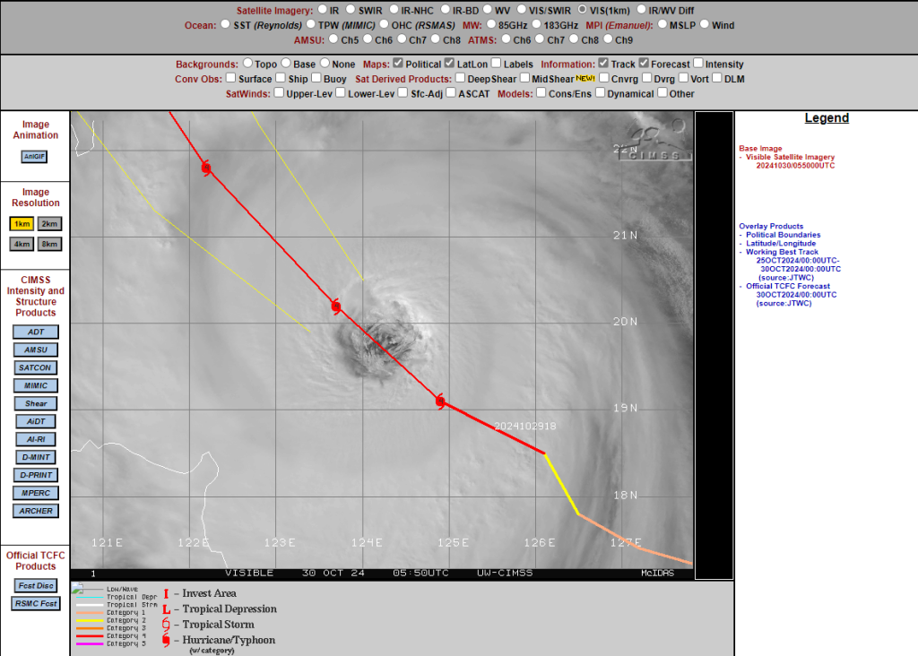 De snelle intensivering is gestopt. Hij is nu als een 130 kt / cat 4 systeem op weg naar het zuiden van Taiwan. Vooral het enorme oog is indrukwekkend.