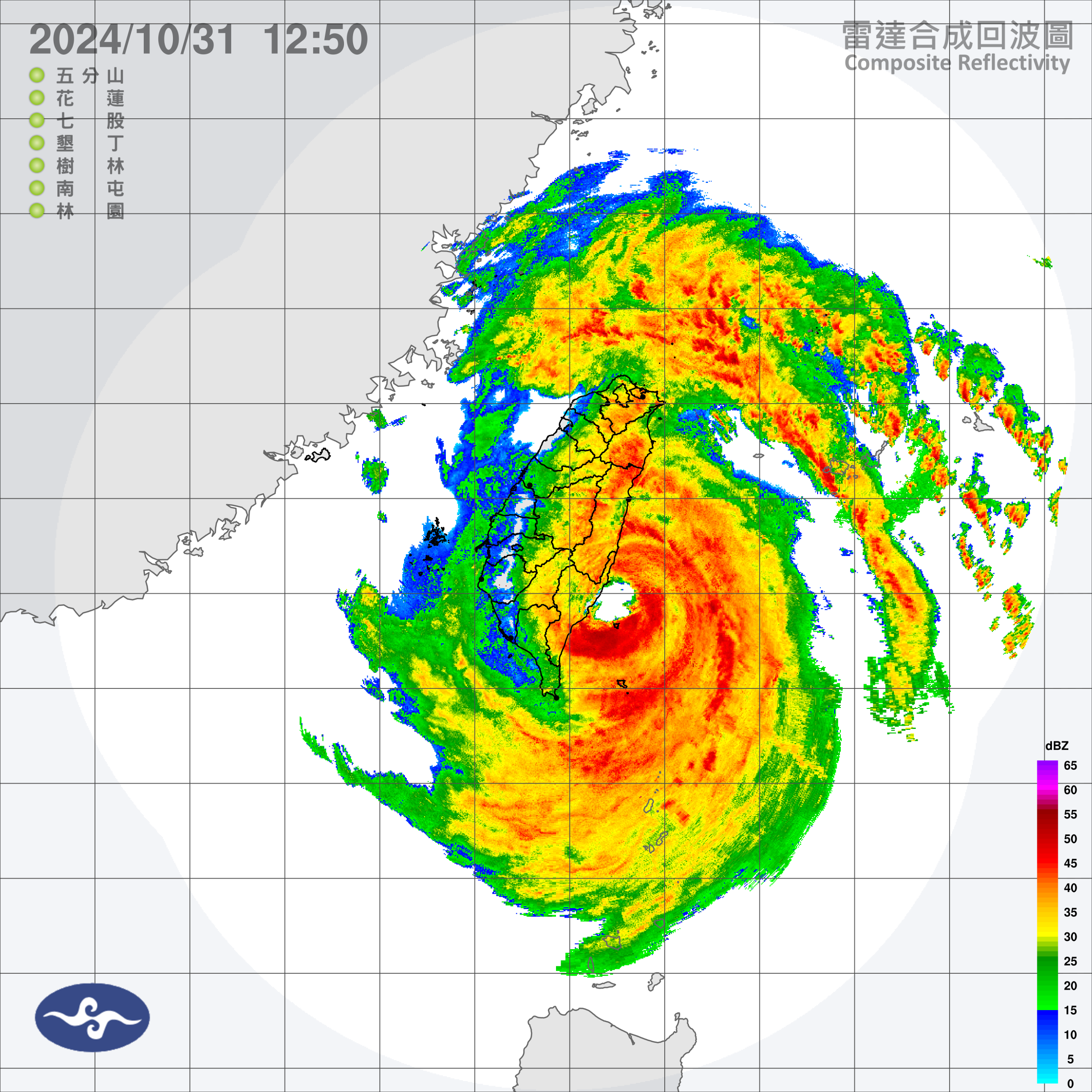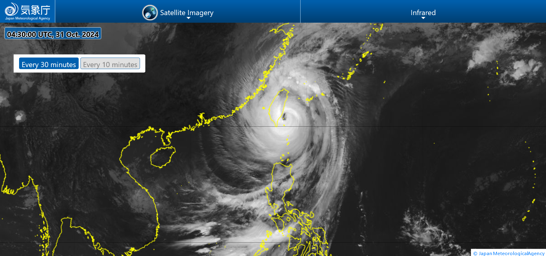 Landfall van Kong Rey is gaande, 198 km/u nog een dikke Cat 3. Eye Wall Replacement is toch gelukt, maar nu zorgen de bergen voor een verstoorde aanvoer van de warme vochtige lucht. Het oog is gerafeld en op de satelietfoto is ook een band met droge lucht zichtbaar.