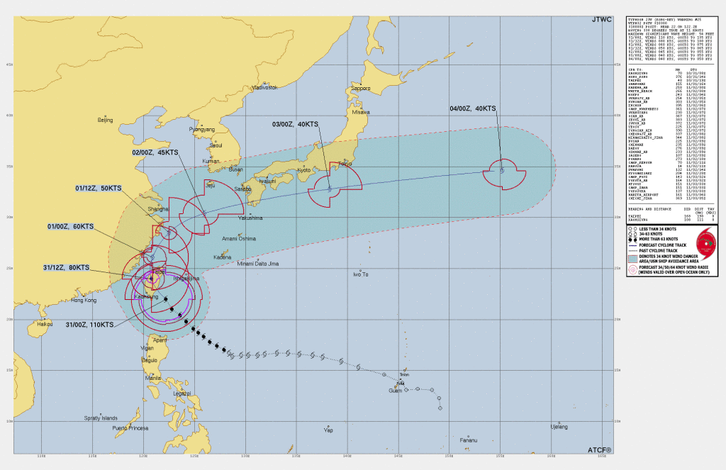 Na passage van Taiwan zou Kong Rey afzwakken tot 72 km/u. De koers word dan Noord en met een grote boog naar het NoordOosten richting Japan.