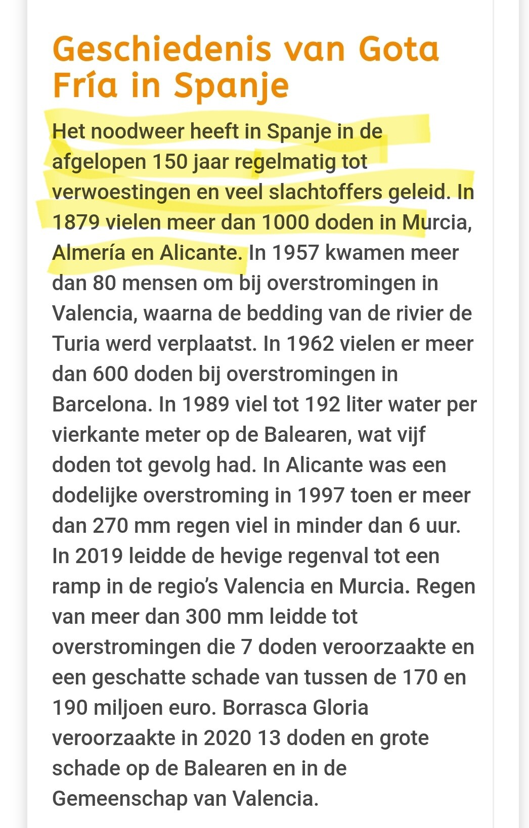 En verder een artikel over 'DANA' met voorbeelden uit het verleden. Voorbeelden die in het Volkskrant artikel niet genoemd worden, daar wordt alleen 1957 aangehaald, waarschijnlijk omdat het toen ook Valencia betrof. Alle andere genoemde gevallen waren echter ook een gevolg van 'DANA' en een aantal daarvan ook in dezelfde regio. Er wordt expliciet misschien niet gezegd dat het ditmaal de zwaarste was maar door één voorbeeld te nemen met inderdaad minder slachtoffers wordt dit wel gesuggereerd en belangrijke gebeurtenissen uit het verleden dus niet meegenomen.