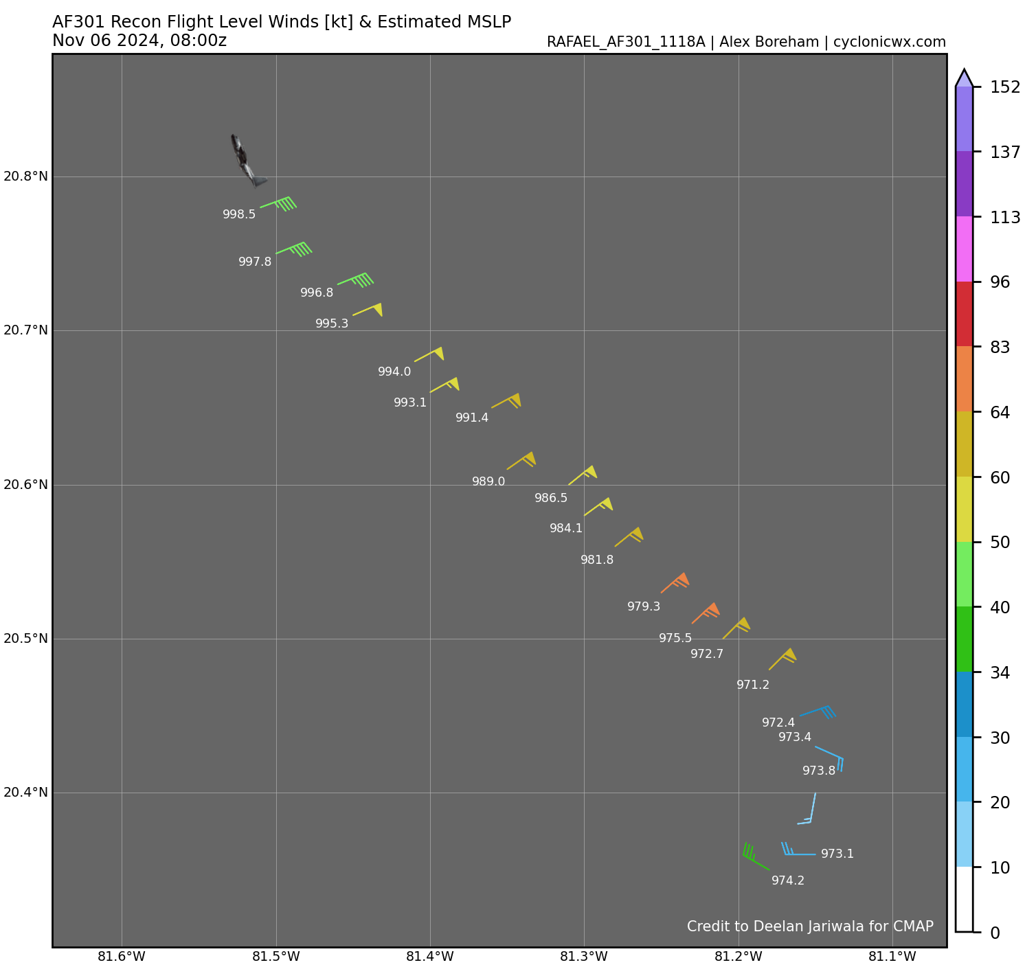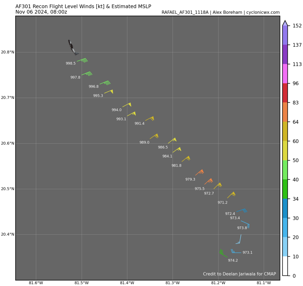 Er is support gevonden voor een luchtdruk van ~971 mb binnen orkaan Rafael door de AF301 Recon-vlucht. Er is een uitdiepingsratio van ongeveer 3 mb/u op dit moment. Het duurt nog zo'n 15 uur voordat de orkaan aan land komt in Cuba. De kans lijkt mij dus aanzienlijk dat de orkaan uit gaat groeien tot de vijfde Major Hurricane van het 2024 Atlantische orkaanseizoen.