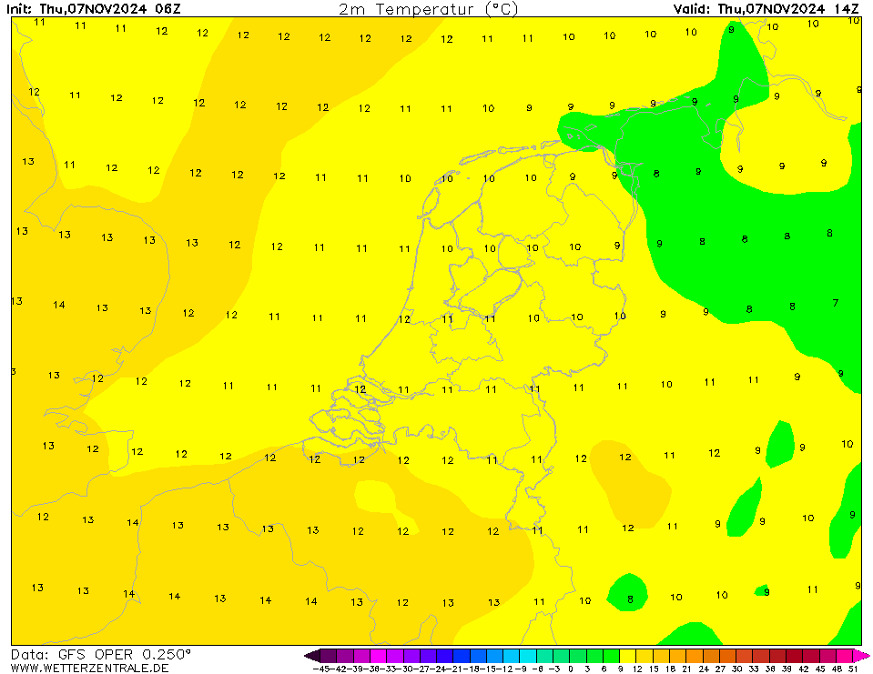 Die liet in de 06Z run van gisteren nog 10 C zie in het oosten voor 15.00 uur. Nou, we zitten nu op 4,3 C....