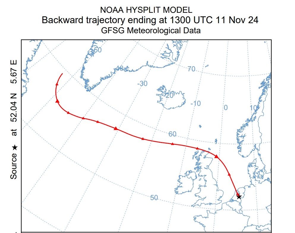 Ik heb even het hysplit backward trajectory model van GFS laten lopen voor tot 72 uur terug: 3 dagen geleden bevond onze (schone) lucht zich nog in de buurt van Groenland, die lucht heeft vandaag de lage landen bereikt.