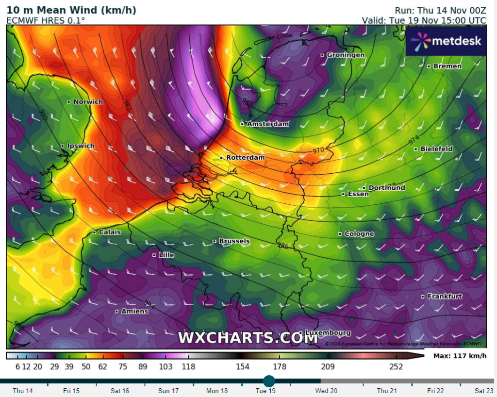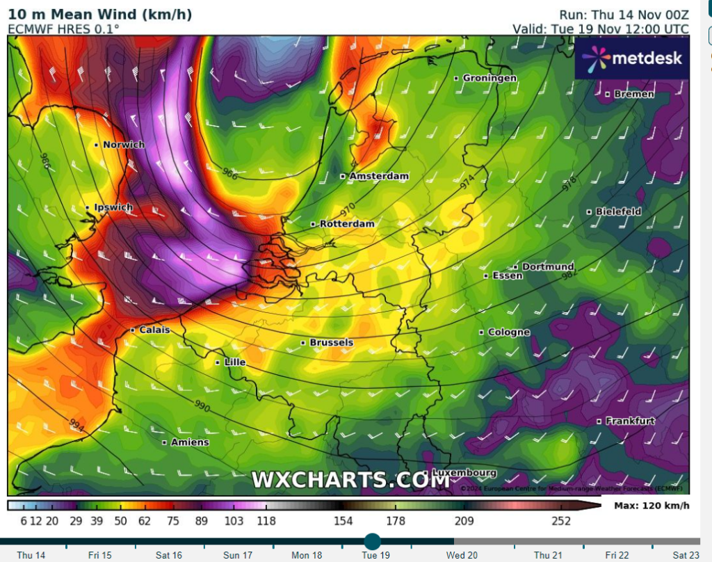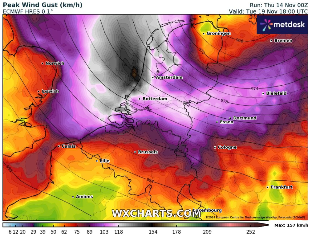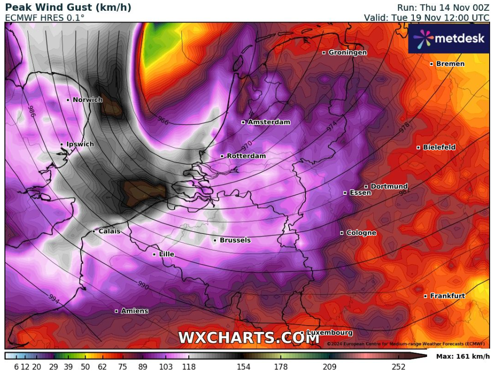 Ook de operationele run van ECMWF is vandaag erg fors voor dinsdag met windstoten van 130-160 km/u langs de Belgische en Nederlandse kust in combinatie met windkracht 11 á 12. In het binnenland windstoten tot 120 km/u. Deze berekende windintensiteit is ongetwijfeld het gevolg van optimale jetinteractie en daarbij explosieve cyclogenese.