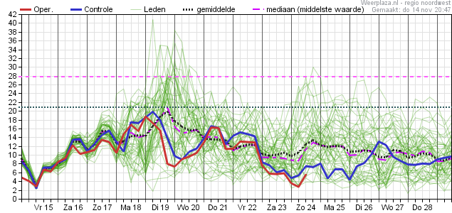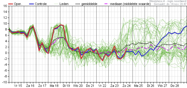 De dauwpuntpluim hieronder laat een flinke bult zien op 18/19 november. Dat duidt op een noordelijke passage van het laag. Daarna kans op winterse buien.