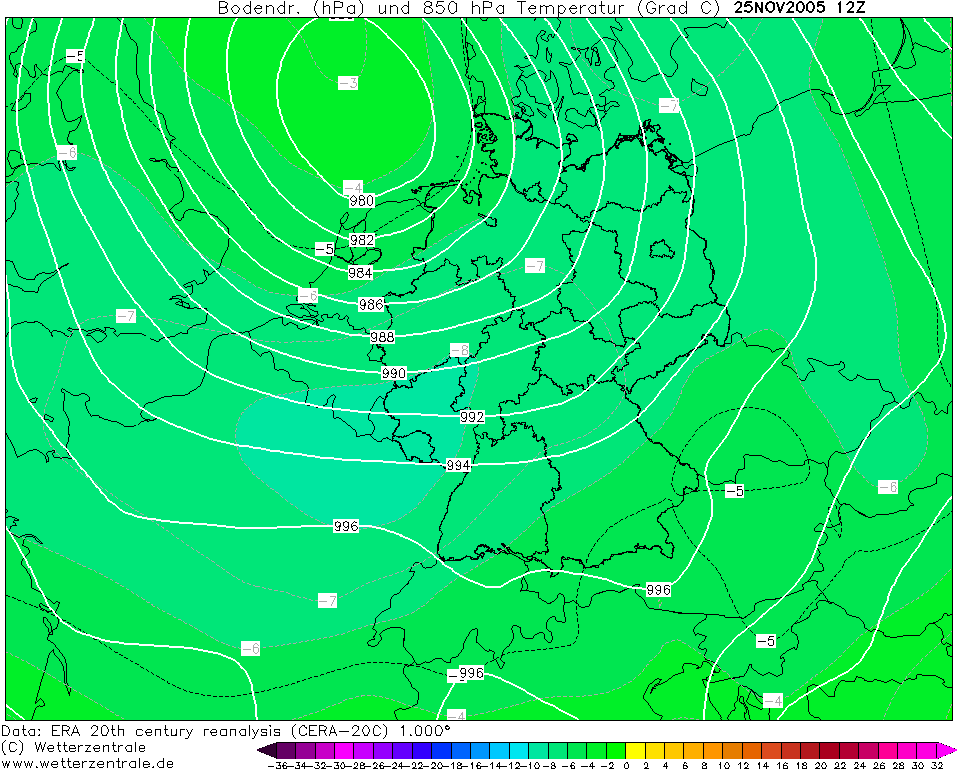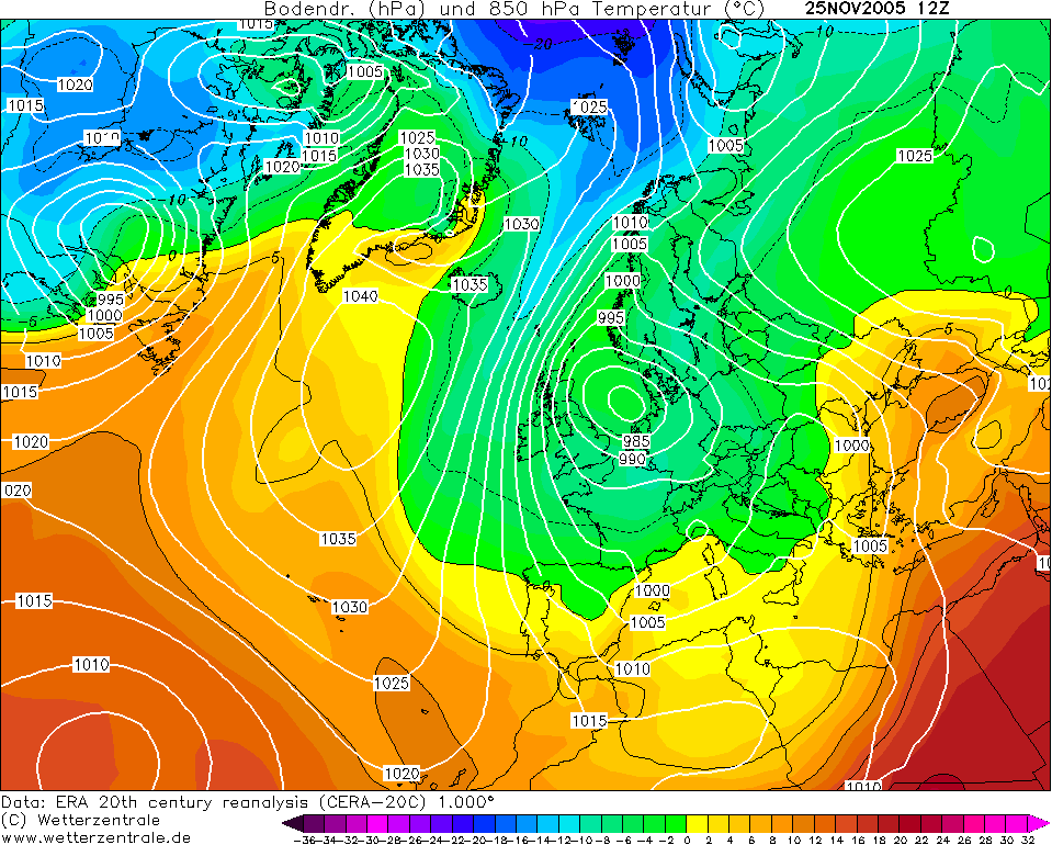 Ten opzichte van komende week en op het 850Hpa vlak in elk geval. Ik weet niet wat de zeewatertemperaturen destijds waren en of dat dus ook vergelijkbaar was als komende week bij een (noord)westelijke aanvoer over zee. Hierbij nog 2 kaarten van de ERA heranalyse van die dag om 12UTC: