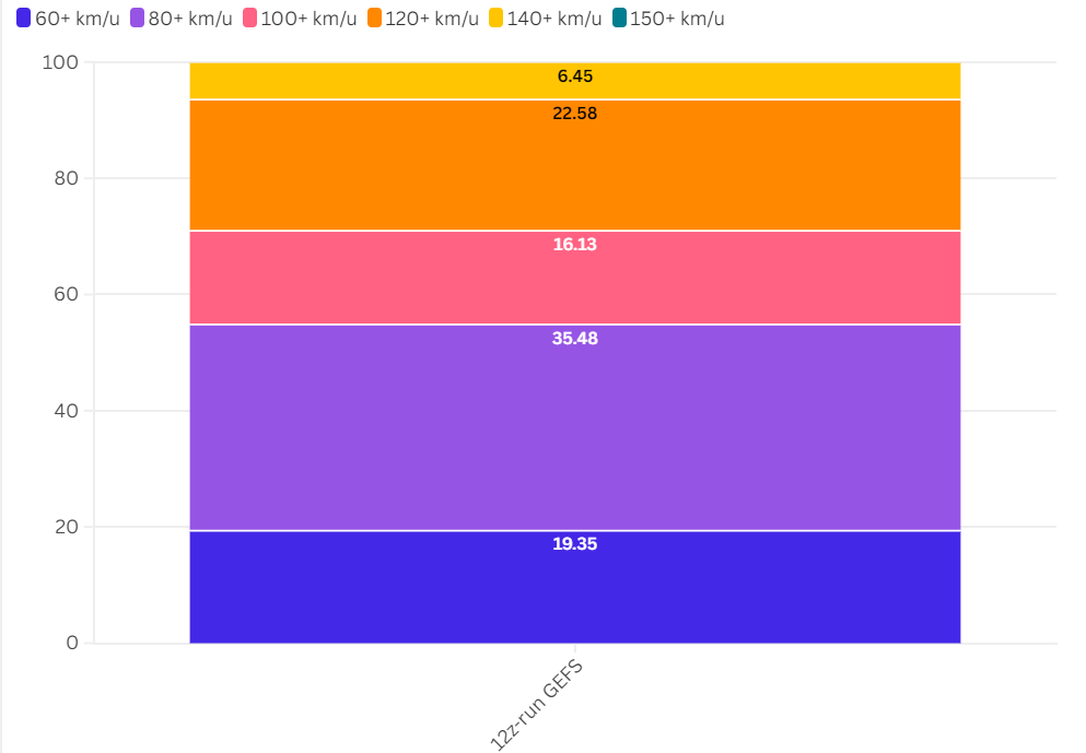 Binnen het GEFS is het percentage leden met windstoten van >120 km/u in het begin van de volgende week op een willekeurige plek in Nederland toegenomen naar 29%. Het percentage leden met windstoten van >100 km/u ligt rond de 45% op dit moment binnen het GEFS. Er is een duidelijke tweedeling zichtbaar binnen de visualisatie.