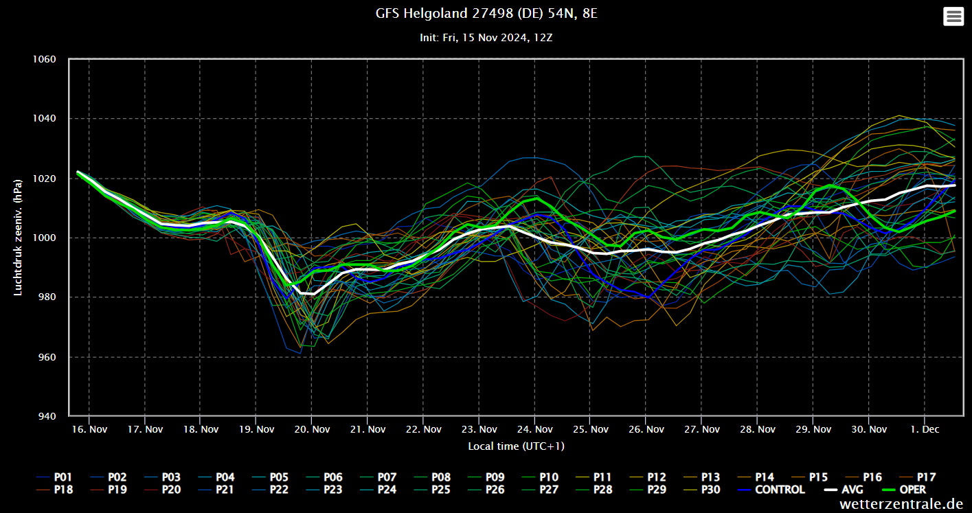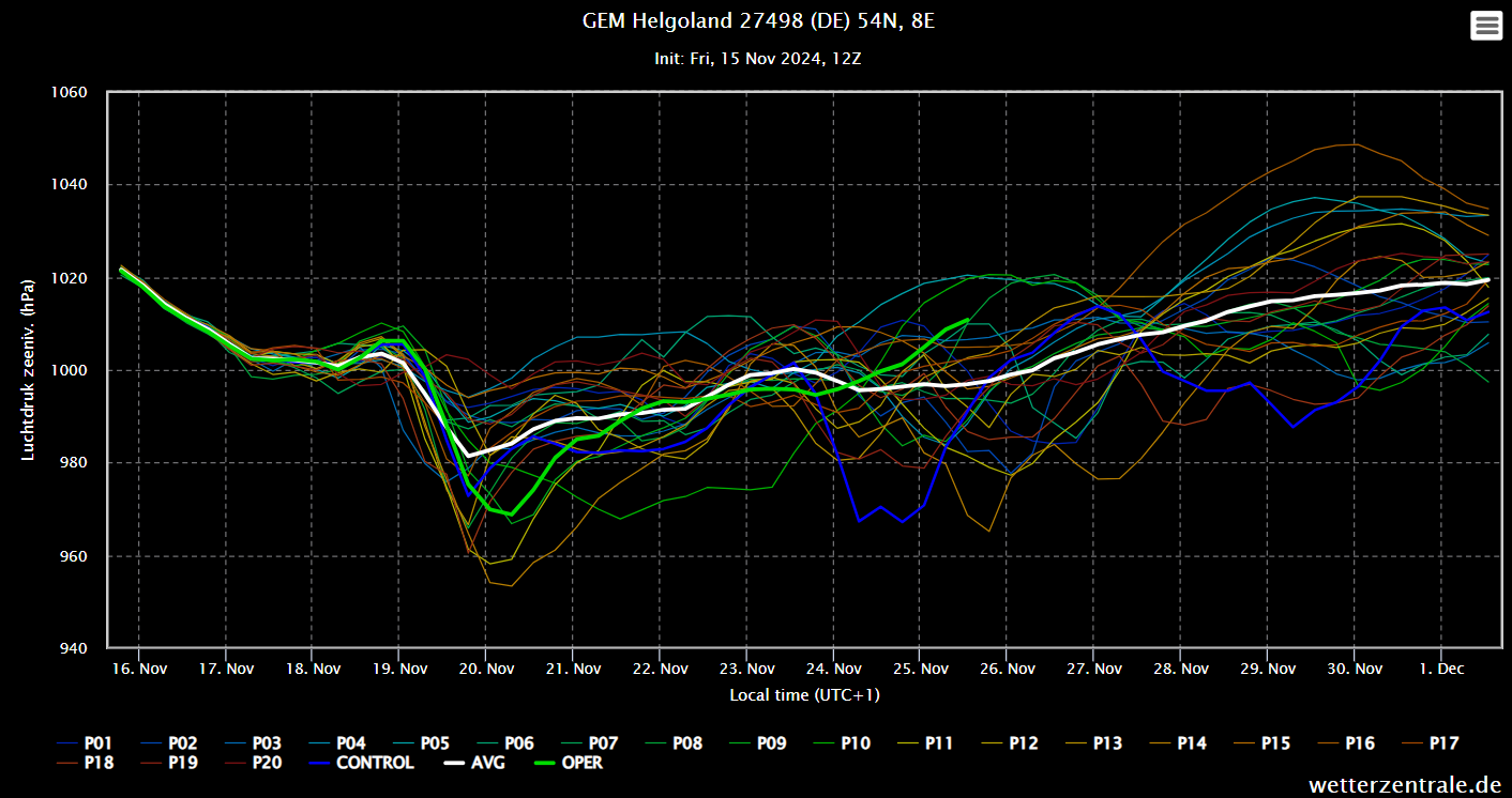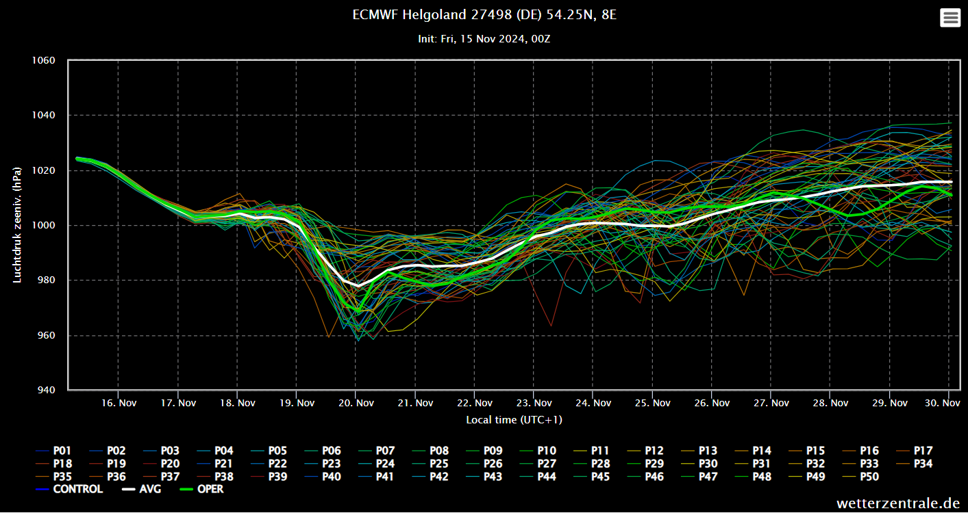 Helgoland ligt waarschijnlijk in het traject van de depressie dus vandaar deze locatie als indicator voor de minimale kerndruk. Er gaan best wat lijntjes richting de 960 hPa. De onzekerheid zit voornamelijk in de snelheid waarmee de depressie uitdiept.
