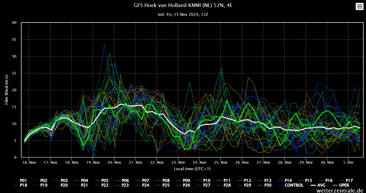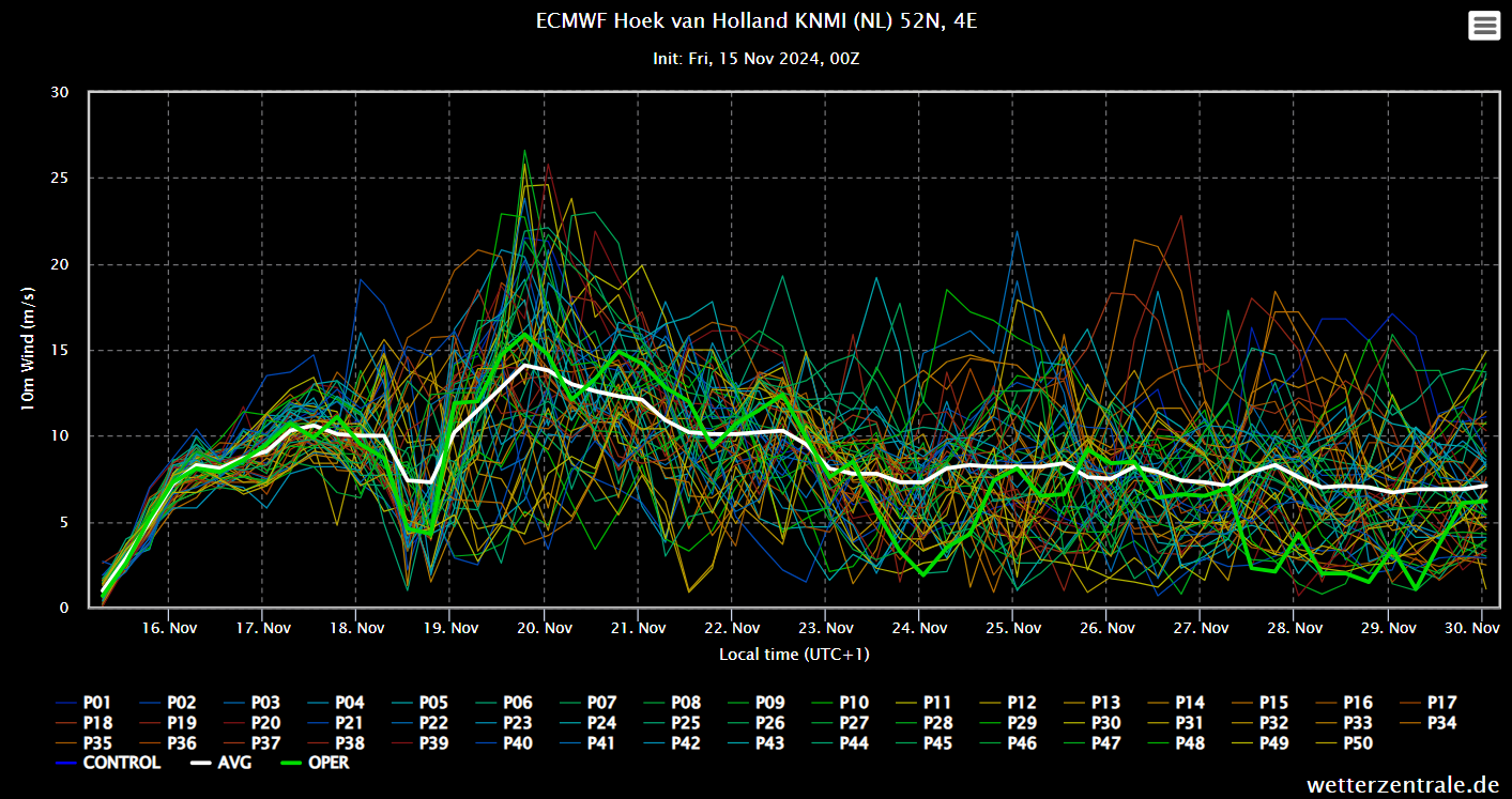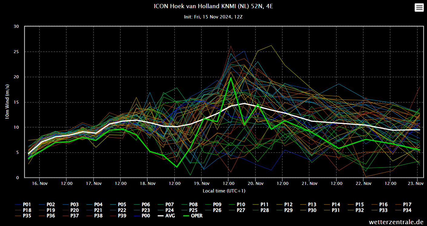Er zitten flinke uitschieters in de ensembles. De meest extreme leden komen tot een gemiddelde windsnelheid van 33 m/s (119 km/h; 12 bft) bij Hoek van Holland (KNMI). Dat zie je ook niet elke dag in de pluim op deze termijn (+96u). En dan te bedenken dat dit waarschijnlijk nog niet eens de piekwaarden zijn. Wel zijn deze extreme leden in de minderheid.