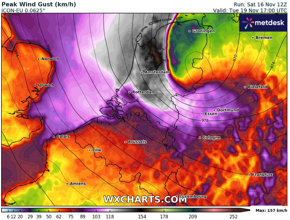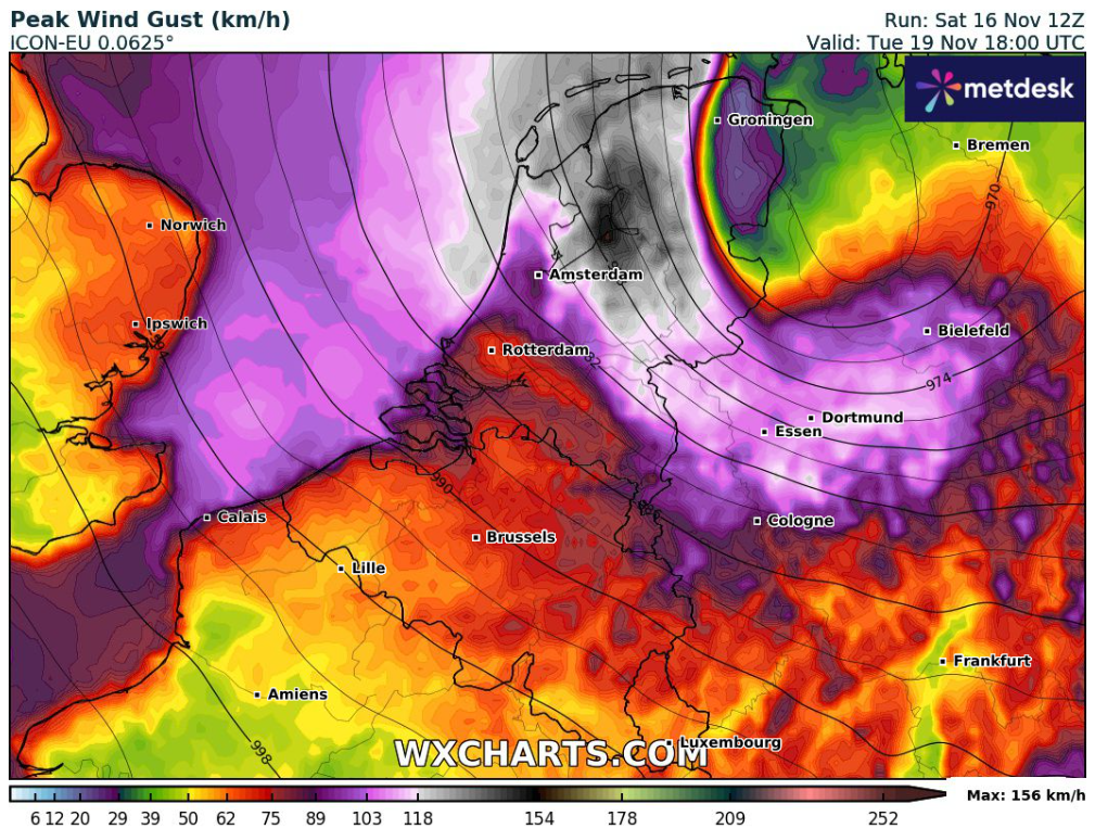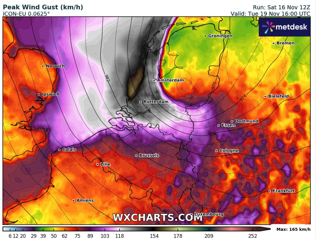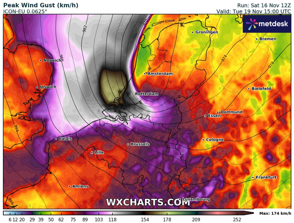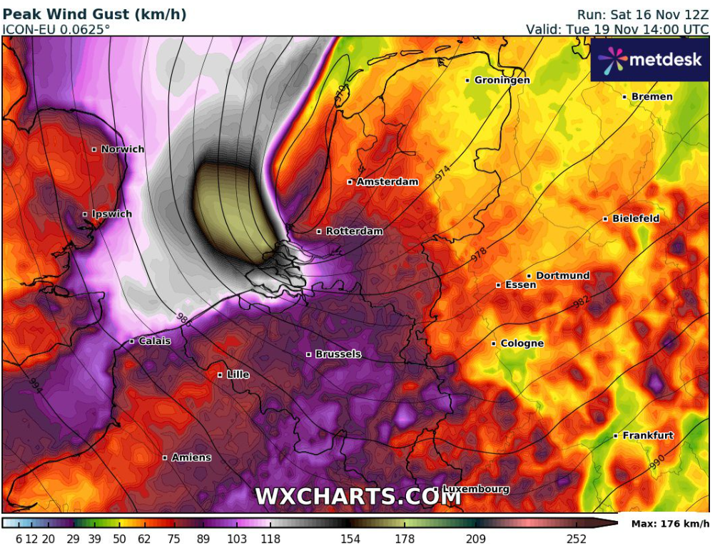 De nieuwste ICON-run komt met windstoten van 176 km/u en in het binnenland van Nederland windstoten van 150 km/u. Voor België worden windstoten tot 130 km/u berekend. Dit windveld ontstaat na explosieve cyclogenese boven de Noordzee. Het bijzondere is dat de kern van de randstoring niet eens ten noorden van Nederland passeert, maar recht over Nederland heen.