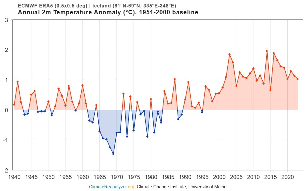 Zie de handige tool op https://climatereanalyzer.org/research_tools/monthly_tseries/ voor de grafiek voor T IJsland sinds 1940.