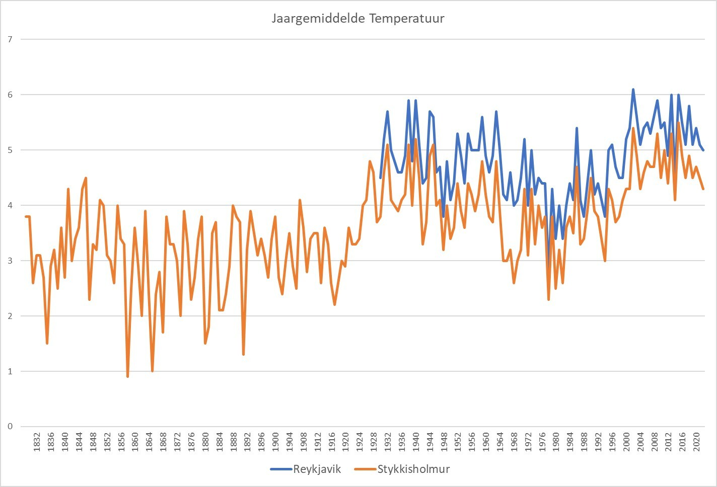 Ik heb de data van Reykjavik en Stykkisholmur gebruikt. Die laatste gaat terug tot 1830, al ben ik niet nagegaan wat de betrouwbaarheid daarvan is. Maar misschien gaat de interesse ook meer uit naar de ontwikkelingen in de afgelopen jaren. Na de snelle opwarming rond 2000 is een soort plateau bereikt. 2014 en 2016 waren zeer warme jaren, daarna daalt de lijn weer. Of dat een trendbreuk is, moet de tijd uitwijzen. Het is in ieder geval opvallend in een wereld die steeds warmer wordt, niet in de laatste plaats het Arctisch gebied. Dit alles hangt samen met de befaamde Blue Blob en dus met het smelten van Groenland en/of de AMOC.