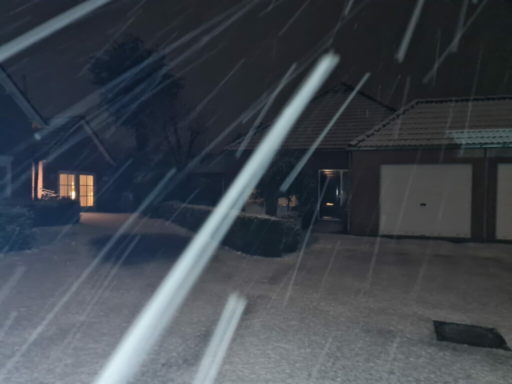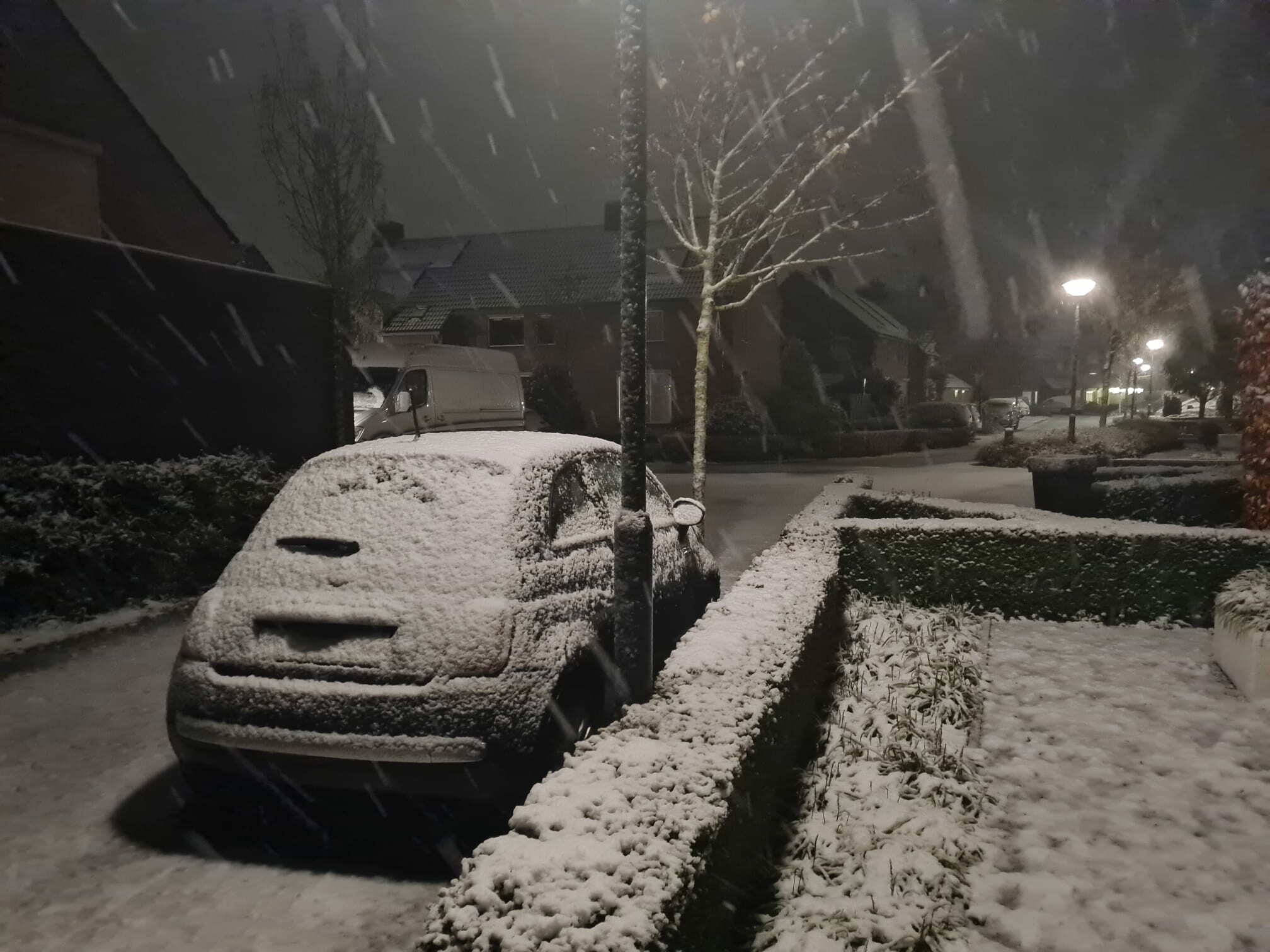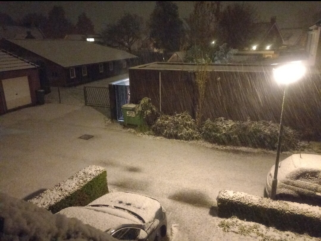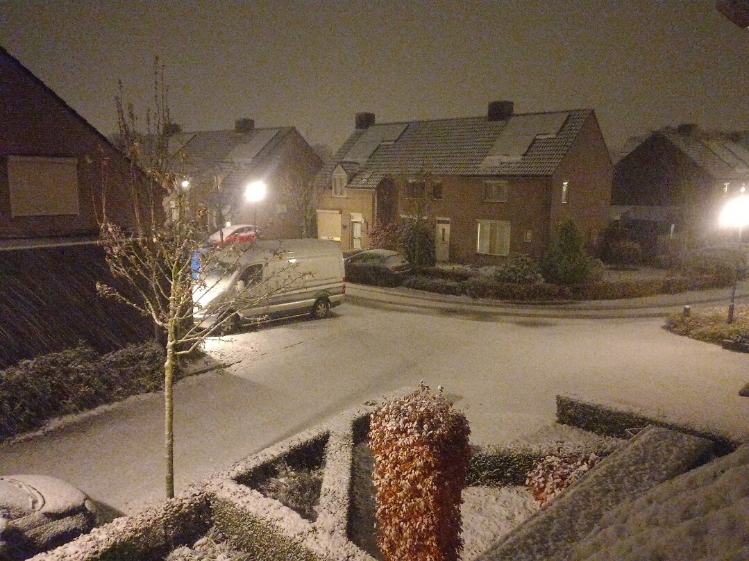 Forse droge sneeuwval nu bij slechts 0,2°C. Wegen worden ook wit. Een mooie witte wereld en dat al in november!