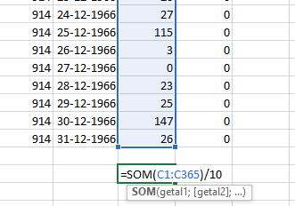Dan krijg je een kladblok document met de losse dagwaarden in tienden mm. Die zet ik in Excel onder elkaar, doe dan op kolom 366 of 367 autosom van alle dagwaarden en dan gedeeld door 10 voor het aantal mm. Beetje saai werk wat minstens een uur of anderhalf kost, maar zodra het af is heb ik wel altijd de jaarsommen neerslag voor 914 Oss. Dan hoef ik die in het vervolg slechts eenmaal per jaar in januari ergens bij te werken.