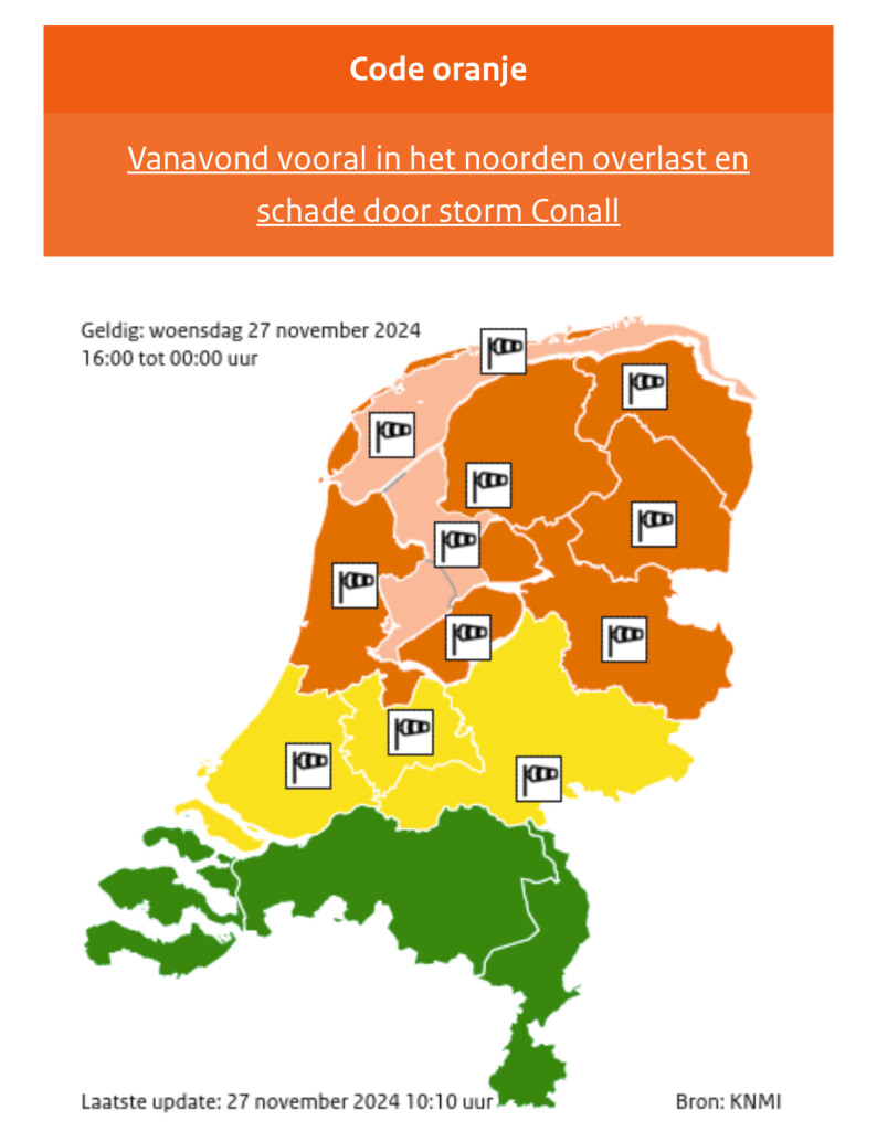 Vanavond geldt in het noorden code oranje voor zeer zware windstoten. Het gaat om de provincies Noord-Holland, Friesland, Flevoland, Groningen, Drenthe en Overijssel. Hier kunnen gevaarlijke situaties ontstaan. Het verkeer zal hinder ondervinden, vooral fietsers en bestuurders van vrachtwagens en auto's met aanhanger moeten alert zijn. Bomen kunnen omwaaien en er is kans op schade aan huizen en gebouwen zoals aan daken.