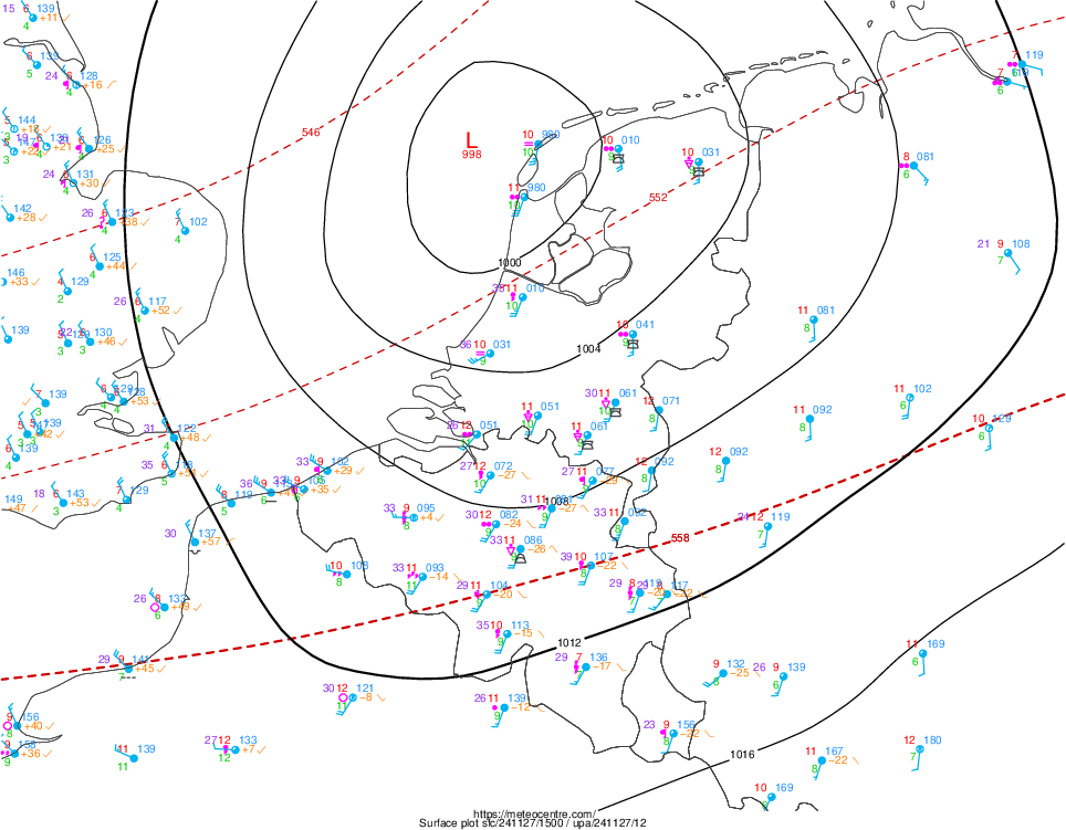 De 996 hPa-isobaar wordt niet ingetekend, maar die zal er nu toch wel zijn, gezien ook de windsnelheid in Den Helder.