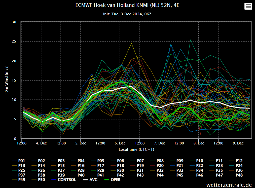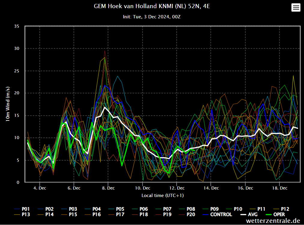 Ook in de ensembles gaat een behoorlijk aantal leden voor een storm, behalve bij EC.