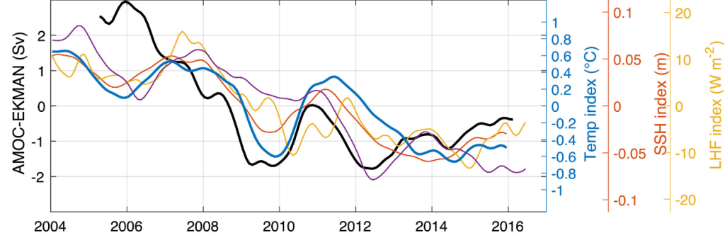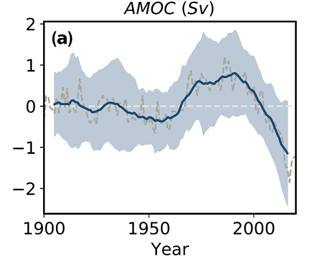 Sinds circa 2000 was de AMOC al aan het verzwakken, het duurde circa tien jaar voordat we het gingen merken. Alleen vanaf 2014 is hij weer wat sterker geworden. Recentelijk lijkt hij weer wat verder af te zwakken.