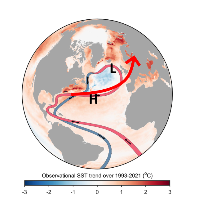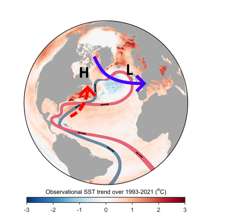 In tweede instantie en hieraan verbonden, breidt de koudepoel boven IJsland zich uit, aangenomen dat de AMOC verder verzwakt.