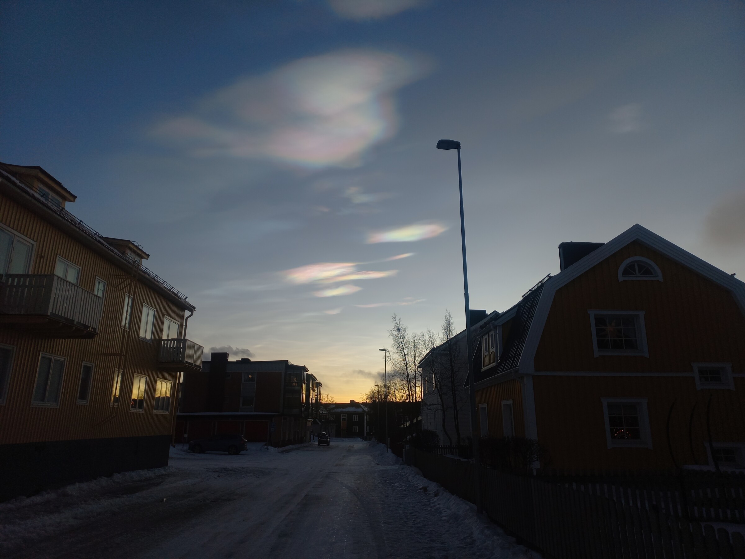 Ik zit nog steeds in Kiruna in Zweeds Lapland en er waren enkele wolken te zien die ik nog niet eerder heb gezien. Het waren een soort kleine rondjes met zelfs verschillende kleuren erin. Ik ben een leek op dit gebied en heb geen idee wat het zijn. Vandaag is de poolnacht begonnen, zou dit ermee te maken kunnen hebben?