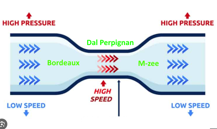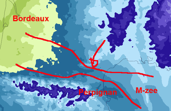Mooi voorbeeld van het zogeheten 'Venturi-effect' gisteren in Zuid-Frankrijk. De westenwind (de Tramontane, soort Mistral-variant) wordt door het dal tussen de bergen van de Pyreneeën en de Haute-Languedoc (rode pijl) gedwongen. Onderstaande afbeelding toont de hoeveelheid waterdamp in de lucht. Je ziet dat de lucht (groen) door het dal wordt geperst. Het dal werkt dus als een trechter, waarin de wind versnelt. Bij Perpignan kwamen gister windstoten van 80-100km/uur voor.