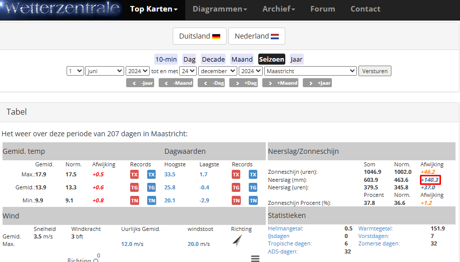 In Eelde en Maastricht viel in de laatste 7 maanden (vanaf 1 juni) ruim 100 mm meer dan normaal (Twente en Heino ook bijv.), in Den Helder 55 mm meer dan normaal, in De Bilt 10 mm meer dan normaal (ongeveer normaal daarmee) en in Vlissingen 31 mm minder dan normaal (Herwijnen ook) oftewel aan de droge kant.