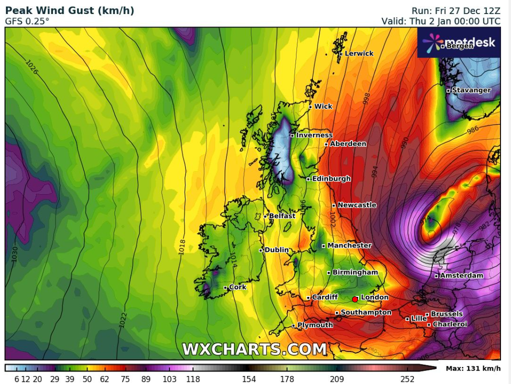 Een behoorlijk pittige run voor de nacht van 1 op 2 januari. Het berekende windveld lijkt onderdeel te zijn van een vrij kleinschalig (nu nog virtueel) lagedrukgebiedje te zijn, dus er valt nog niet zoveel over te zeggen, behalve dat de potentie op een RaCy aanwezig is.