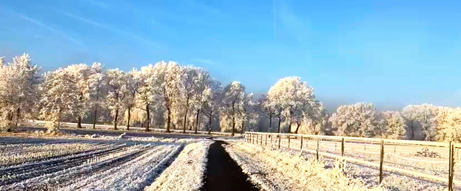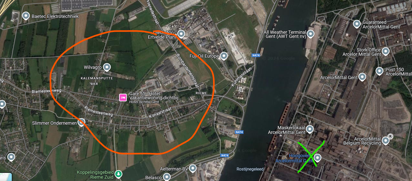 Lokaal dus ruige rijp in Rieme nabij Ertvelde (rood omcirkeld) als gevolg van de nabijheid van de hoogovens van Sidmar (groen kruis).