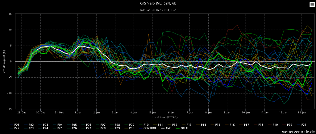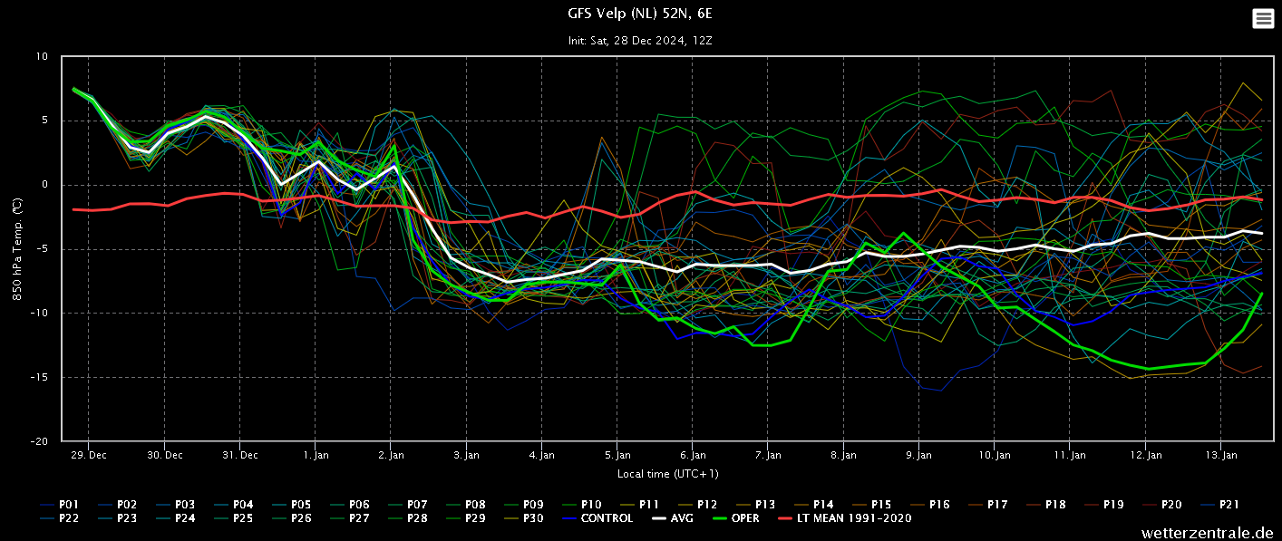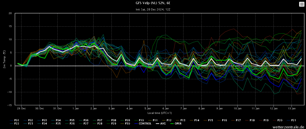 Het gemiddelde blijft langdurig onder de 3 graden zitten vanaf 4 januari, en dat is voor mijn normen en waarden toch wel licht winters. De hoge minima verklappen de aanlandige aanvoer, de koude bovenluchten maken duidelijk dat het een guur weertype is met sneeuwbuien. Wel liggen de OPER en de CONTROL veelal beiden onderin het ensemble, maar meestal niet de koudste oplossing. Vooralsnog even voetjes op de grond. Maar dat ze niet veel van elkaar afwijken is wel weer mooi.