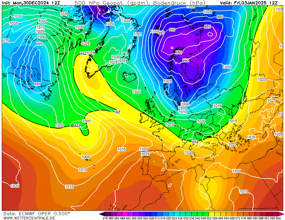 Mooie warmte-advectie in de maak op de Oceaan. Deze is veel beter dan in de 00z run. De 06z run zat er een beetje tussenin. Hoofdzakelijk lijkt er in deze 12z run alle details al wat beter uit te gaan vallen op +96 waardoor de kans toeneemt op een mooi vervolg. Wel hebben wij op +96 nog een aanlandige stroming vanuit het noordwesten.