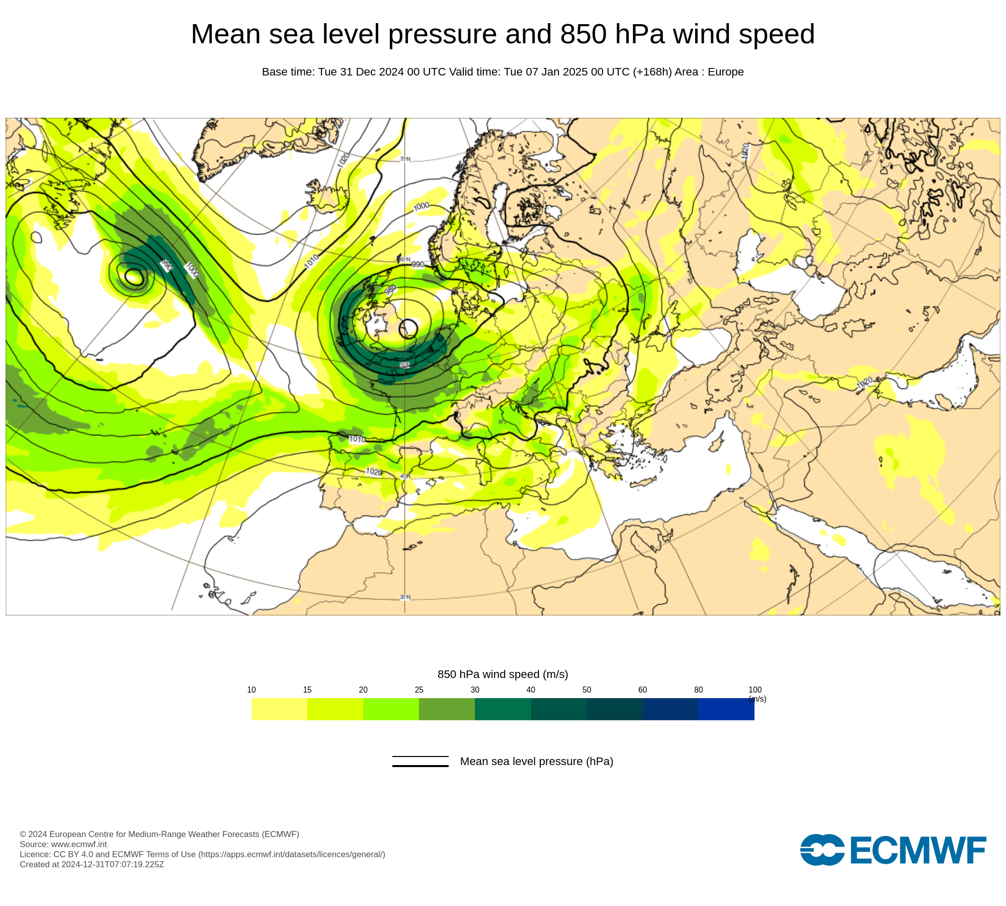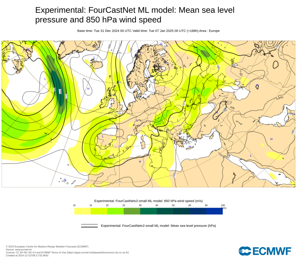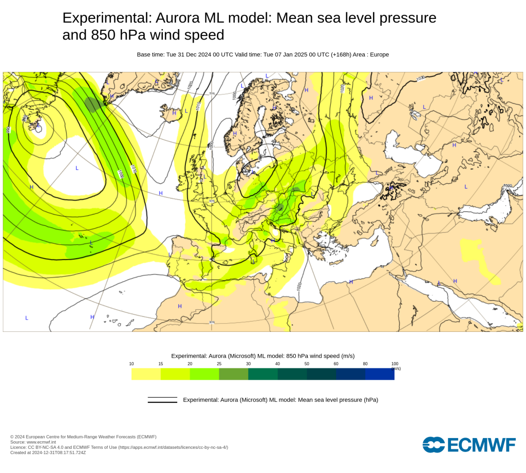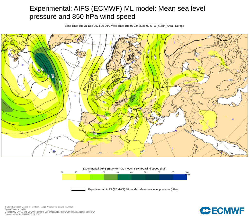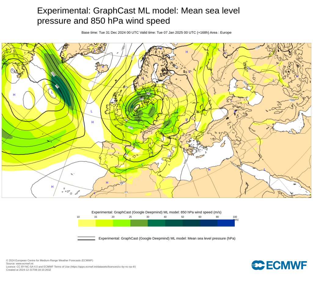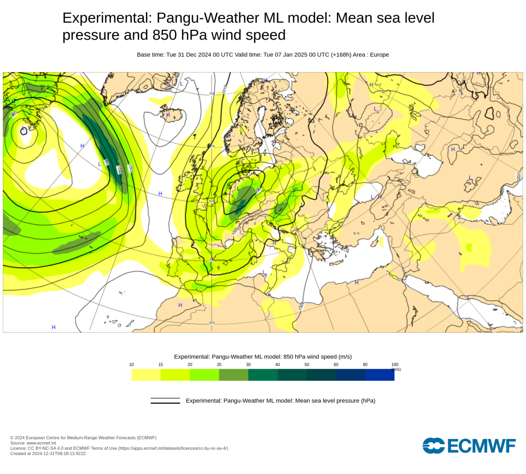 En ter referentie, bovenaan is de ECMWF OPER. Alle AI-modellen zou je 'beter' kunnen noemen dan ECMWF, maar bij GraphCast komen we rond 7 januari alsnog tijdelijk even in de zachte sector terecht en bij Aurora en Pangu-Weather scheelt het niet veel.