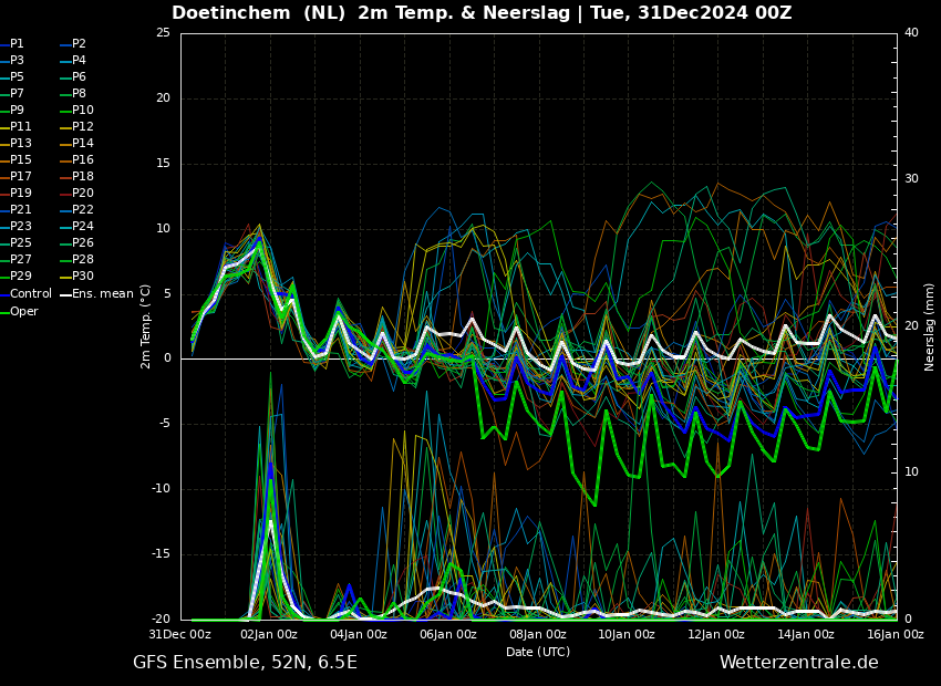 Koude cluster die voor ruwweg nipt positieve maxima gaat. Kijk ook naar de neerslagsignalen met vermoedelijk sneeuwkansen en negatieve dauwpunten. (dus weinig dooi)