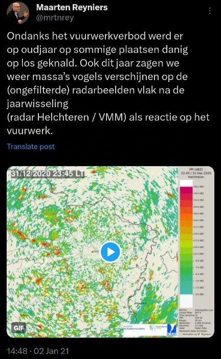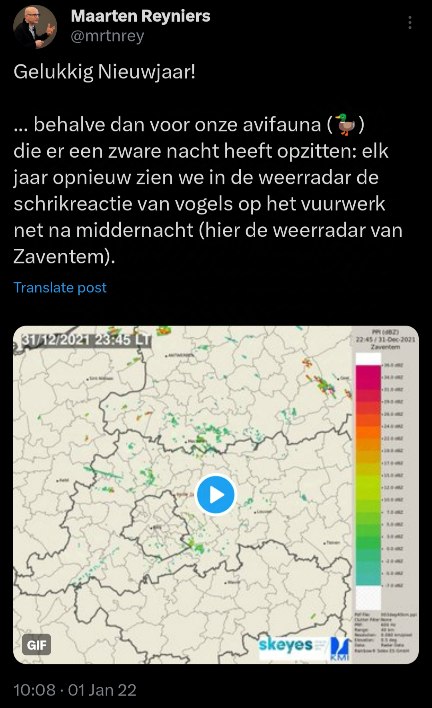 Uiteraard schrikken vogels in België ook van vuurwerk, zie bijvoorbeeld de animaties van eerdere jaren: