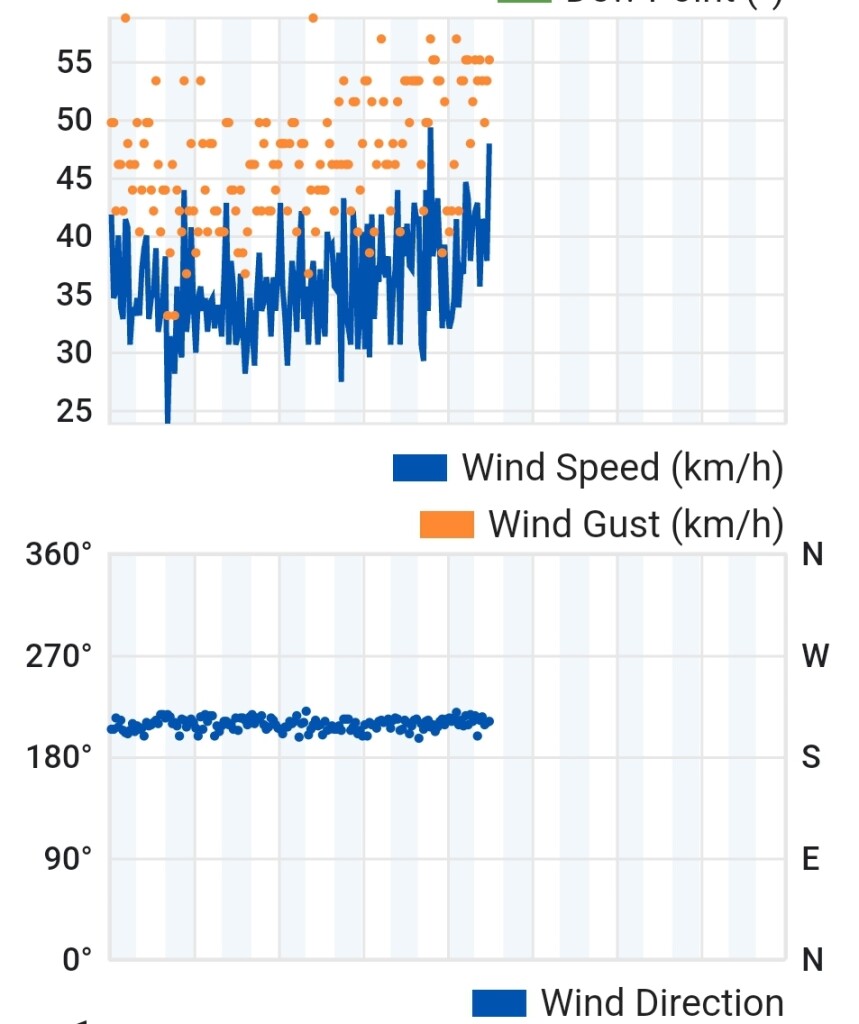 Zwaarste windstoot hier tot nu toe 58,7 km/u.