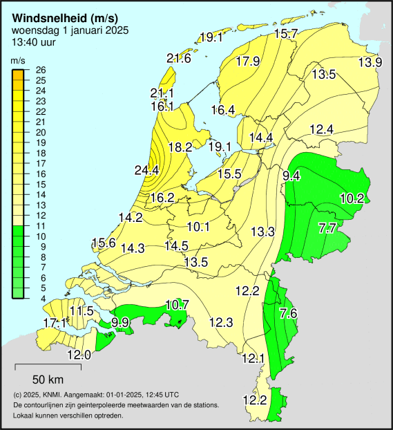 24.3 m/s in IJmuiden, zeer zware windstoot van 101 km/u in Berkhout.