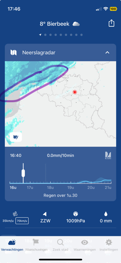 Op het radarbeeld van het KMI is de smalle intense regenband beter te zien.