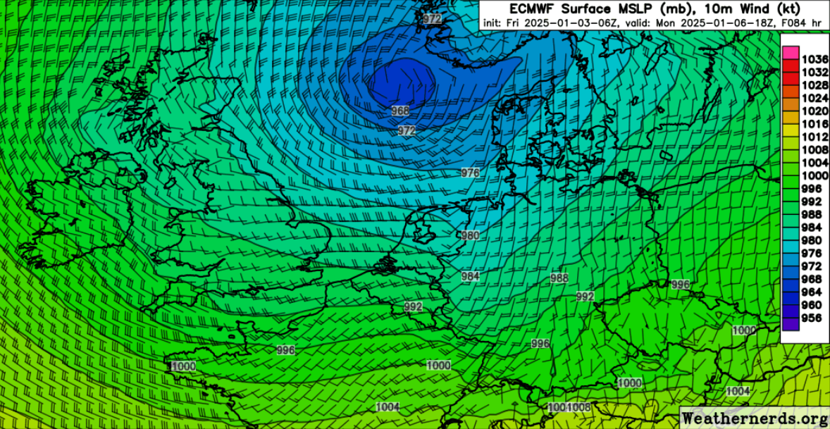 Er wordt een trog berekent door de operationele run (12z) van ECMWF, deze lijkt verantwoordelijk te zijn voor de gesimuleerde (zeer) zware windstoten. Binnen de trog is er een maximale berekende luchtdrukgradiënt van ongeveer 6 Pa/km, wat vergelijkbaar is met een storm. Het is dan ook niet zo vreemd dat er (zeer) zware windstoten worden berekent in het binnenland, deze zijn plausibel op basis van de luchtdrukgradiënt. De ontwikkeling van deze trog is nog wat onzeker, maar indien deze ontwikkelt, dan kan het onstuimig worden in de Benelux.