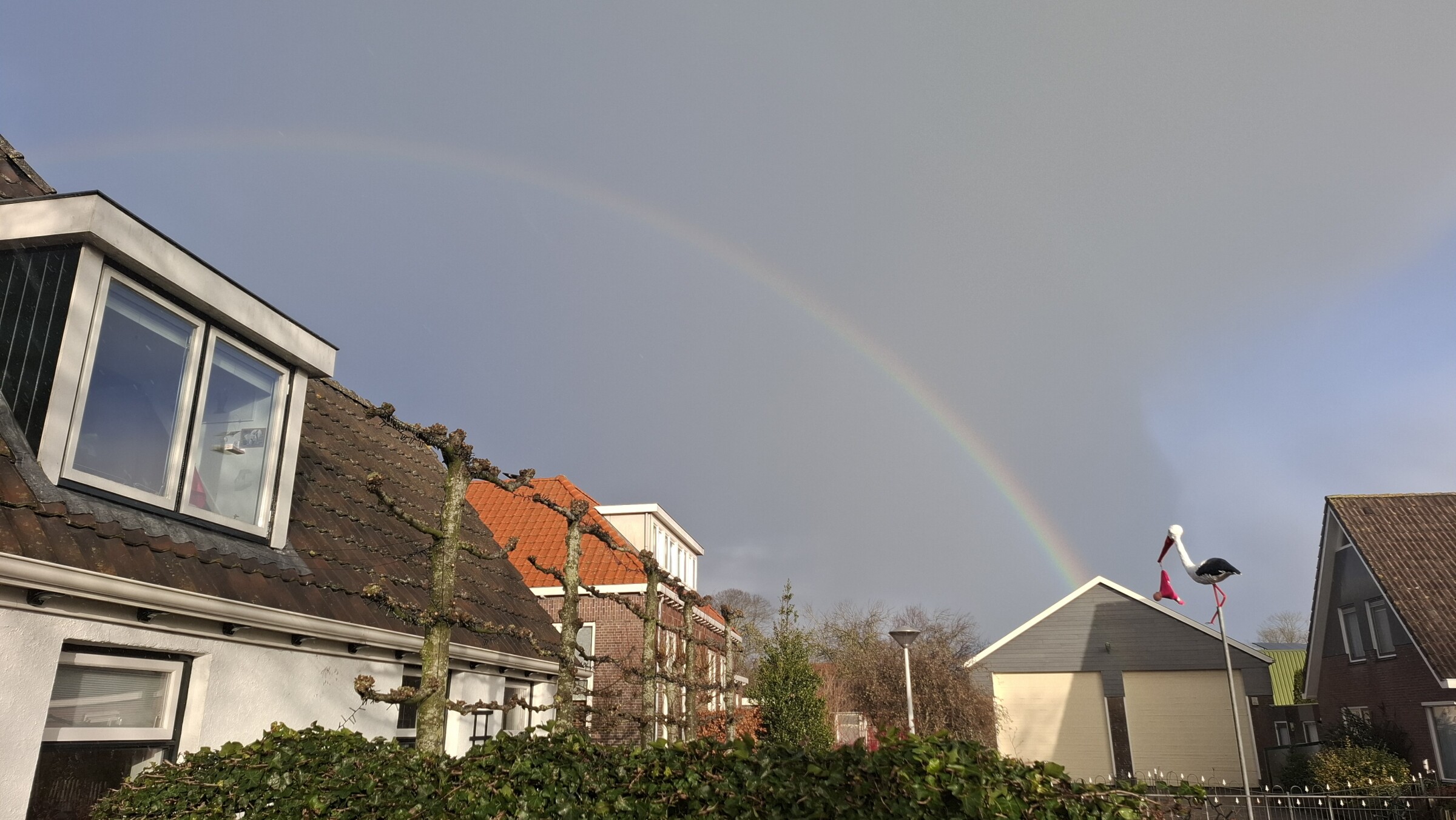 Kerstavond is onze dochter geboren. De ooievaar staat mooi in de tuin en gister nog een mooie regenboog er bij!